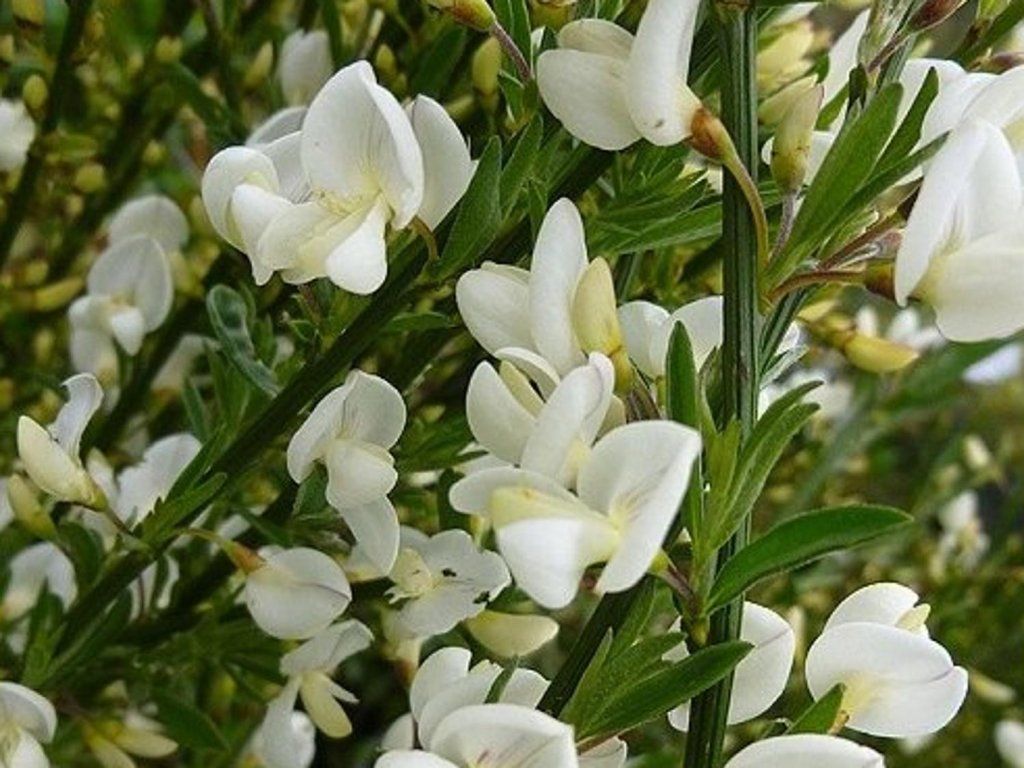 Geißklee 'Albus' - anspruchsloser, laubabwerfender Strauch. Blüht weiß von Mai bis Juni. Erreicht eine Höhe von 50-150 cm bei gleicher Breite. Mag keinen starken Rückschnitt. Wir pflanzen an einen vollsonnigen Standort, in humosen, gut durchlässigen Boden. Winterhart.