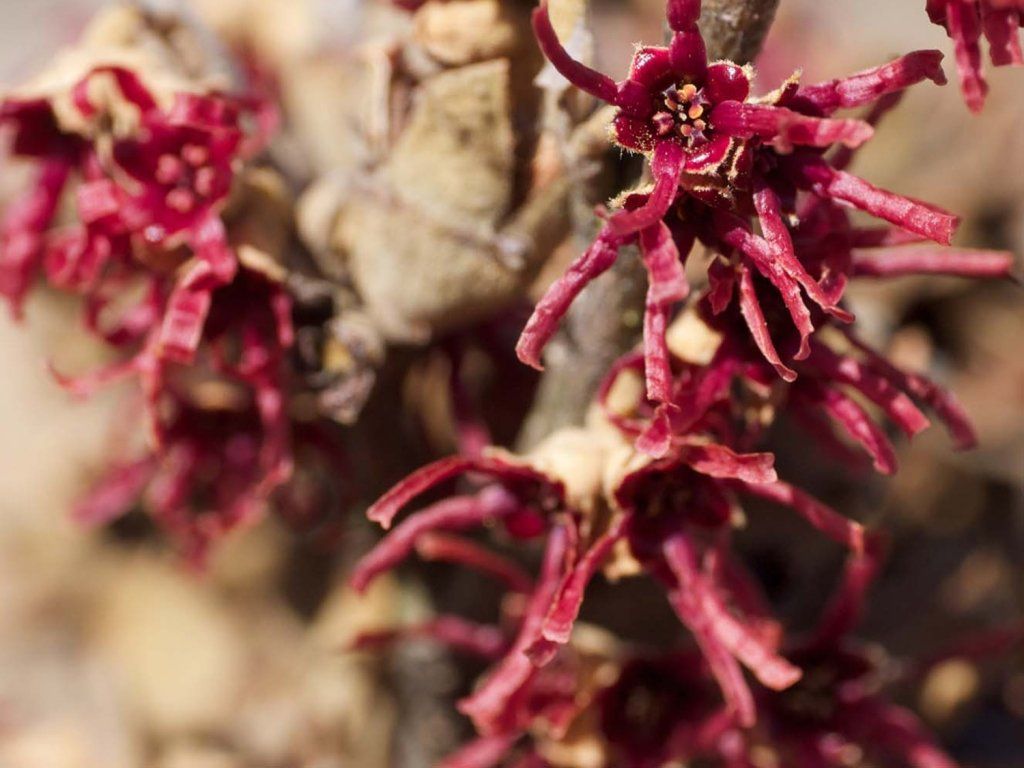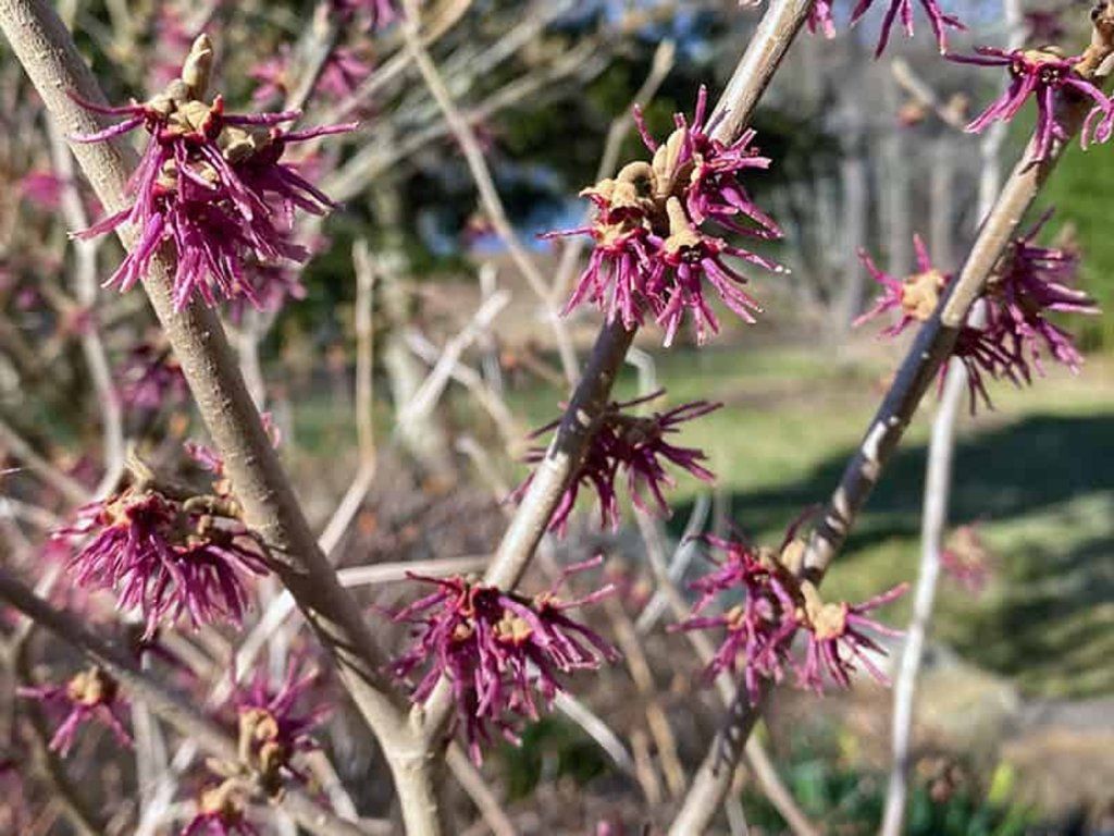 Frühlings-Zaubernuss 'Amethyst' - eine sehr attraktive und geschätzte Zierkultivar der Zaubernuss, die sich durch ihre ungewöhnlichen purpurroten bis violett-weinroten Blüten, ihren starken süßen Duft und ihre frühe Winterblüte auszeichnet. Sie gehört zu den am frühesten blühenden Zaubernüssen und ist die ideale Wahl für diejenigen, die mitten im Winter Farbe und Duft im Garten haben möchten. Wächst als sommergrüner, langsam wachsender Strauch, 2 bis 3 Meter hoch und oft auch ähnlich breit. Der Habitus ist kompakt, dicht verzweigt und natürlich abgerundet, bei der Frühlings-Zaubernuss insgesamt niedriger und geschlossener als bei den Mittleren Zaubernüssen. Die Blätter sind oval, tiefgrün und färben sich im Herbst in schönen Gelb-, Orange- und Rottönen, was den Strauch auch im Herbst dekorativ macht. Die Blüten erscheinen von Dezember bis Februar, oft sehr früh, manchmal schon um den Jahreswechsel. Sie zeichnen sich durch schmale, bandförmige, leicht verdrehte Kronblätter aus. Die Blütenfarbe ist dunkelpurpur bis amethystrot, manchmal mit einem leichten bräunlichen Stich. Die Blüten haben einen ausgeprägten, süßlich-würzigen Duft, der bei der Frühlings-Zaubernuss zu den stärksten gehört. Bei starkem Frost ziehen sich die Blüten zusammen und öffnen sich nach der Erwärmung wieder. Er kommt vor allem als Solitärstrauch an einem gut sichtbaren Ort zur Geltung, idealerweise in der Nähe von Wegen, Eingängen oder Terrassen, wo seine Winterblüte und sein Duft geschätzt werden. Dank seiner geringeren Größe ist er auch für kleinere Gärten geeignet.