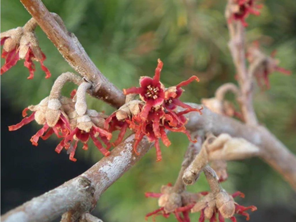 Frühlings-Zaubernuss 'Lombart´s Weeping' - eine außergewöhnlich interessante und seltenere Zierform der Zaubernuss, die sich vor allem durch ihren überhängenden, elegant geschwungenen Wuchs und ihre frühe Winterblüte auszeichnet. Sie gehört zu den Zaubernüssen mit einem einzigartigen Habitus, der sie auch ohne Blüten sehr dekorativ wirken lässt. Sie wächst als laubabwerfender, langsam wachsender Strauch, der normalerweise 2 bis 3 Meter hoch wird, wobei sich seine Äste deutlich bogenförmig neigen und eine überhängende, malerische Form bilden. Der Habitus ist breit ausladend, kaskadenförmig und sehr elegant, was ihn zu einem attraktiven Solitär für repräsentative Gartenbereiche macht. Die Blätter sind oval, tiefgrün und färben sich im Herbst in schönen Gelb-, Orange- bis Rottönen. Die Blüten erscheinen sehr früh, oft von Dezember bis Februar. Sie bestehen aus typischen schmalen, bandförmigen, leicht verdrehten Kronblättern. Die Blütenfarbe ist meist gelb bis gelb-orange, manchmal mit einem zarten rötlichen Hauch an der Basis. Die Blüten duften zart und bringen Farbe in den Garten während der Winterruhe. Bei starkem Frost ziehen sich die Blüten zusammen und öffnen sich nach der Erwärmung wieder. Er eignet sich vor allem als Solitärstrauch, wo seine hängende Silhouette zur Geltung kommt, zum Beispiel an Eingängen, in Wintergärten, an Blickpunkten oder in Kombination mit immergrünen Gehölzen. Dank seines einzigartigen Habitus ist er das ganze Jahr über dekorativ.
