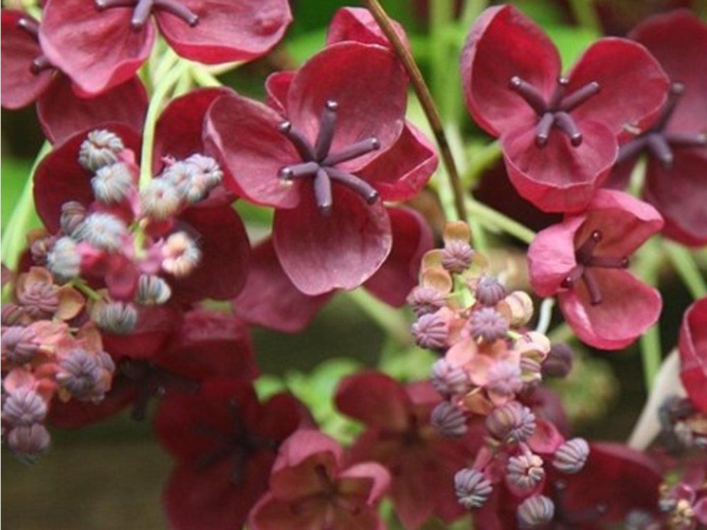 Akebie fünffach - eine Kletterpflanze aus Japan, Korea und Zentralchina, wo sie an den Rändern lichter Wälder, in Gebüschen und an felsigen Hängen wächst. Unter unseren Bedingungen erreicht sie eine Höhe von 6-10 m und bildet verschlungene, biegsame, verholzte Triebe, die schnell Stützen überwuchern. Die Blätter sind handförmig fünfteilig, bestehend aus glänzenden, elliptischen Blättchen, die während der gesamten Vegetationsperiode einen weichen, texturierten Effekt erzeugen. In milden Wintern bleiben einige Blätter erhalten, in kälteren Lagen wirft die Pflanze ihr Laub ab. Die Blüte beginnt früh, normalerweise im April und Mai. Die Blüten wachsen in Trauben, sind purpurviolett bis schokoladenbraun, duften angenehm und locken bestäubende Insekten an. Akebie ist einhäusig und trägt männliche und weibliche Blüten innerhalb einer Traube. In warmen Sommern kann sie auch Früchte tragen, die im Herbst reifen und ein feines, süßlich-aromatisches Fruchtfleisch enthalten. Die Früchte sind länglich geformt und öffnen sich bei Reife, wodurch hell gefärbtes, weiches Fruchtfleisch freigelegt wird. Sie werden eher als seltene Delikatesse oder als dekoratives Element verwendet. Für Gartengestaltungen wird sie am häufigsten zur Begrünung von Pergolen, Zäunen oder unansehnlichen Mauern verwendet, wo sie eine dichte grüne Wand bildet. Sie lässt sich gut mit Clematis, Kletterrosen oder Frühlingssträuchern kombinieren, die ihre frühe Blüte hervorheben.