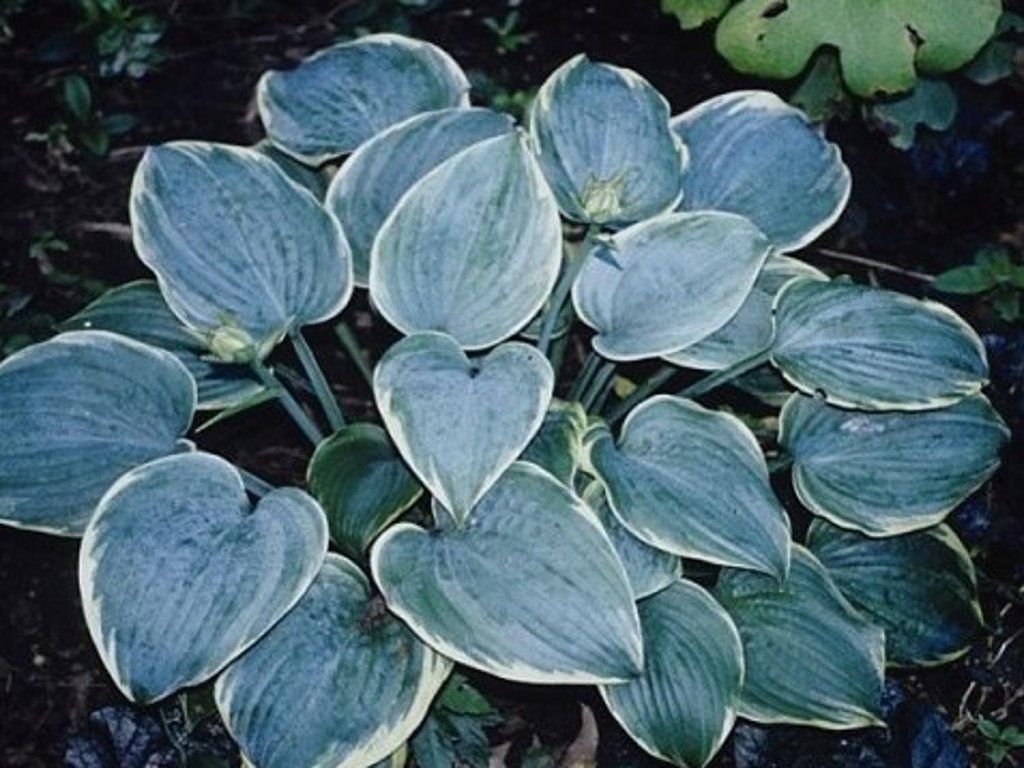 Hosta 'Blue Flame' - beliebte Sorte mit dunkelgrünen Blättern mit einem Hauch von Blau. Die Hosta hat panaschierte Blätter, die Ränder sind cremeweiß verziert. Sie erreicht eine Höhe von 35 cm und blüht ab Mai mit weißen Blütenständen.