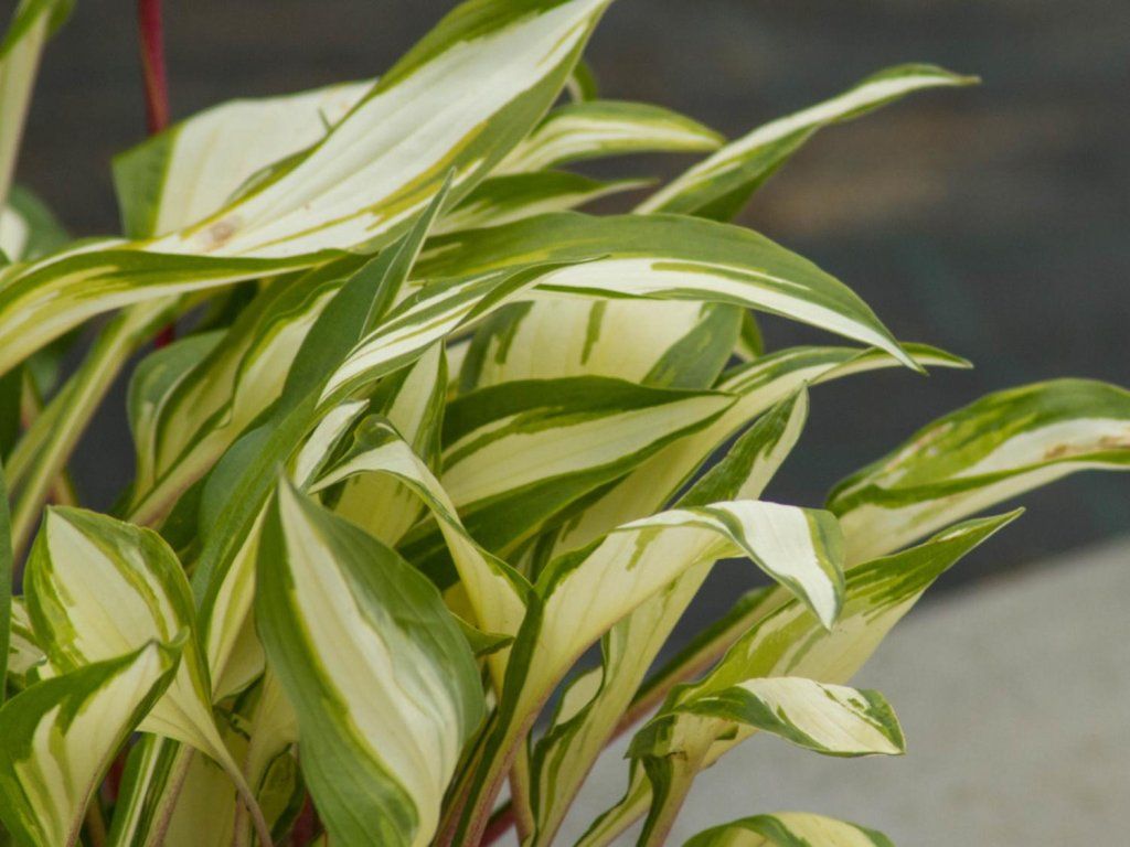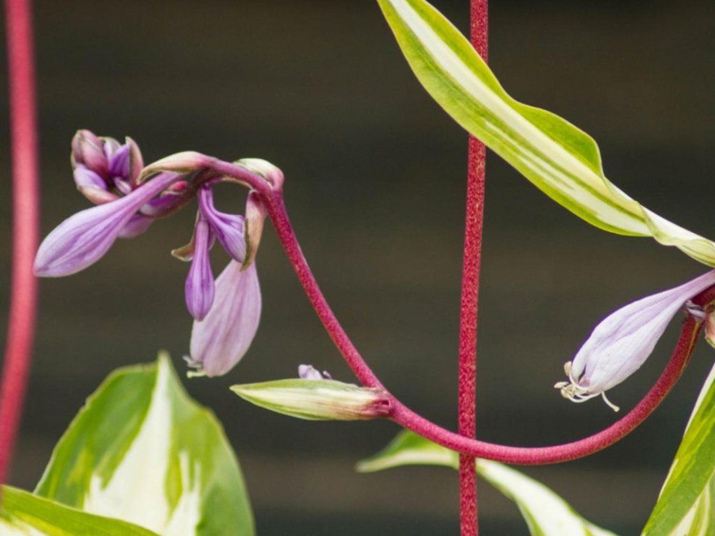 Funkia 'Cherry Berry' - interessante und sehr ansprechende Staude. Die Blätter sind länglich geformt, dunkelgrün mit cremeweißer Maserung. Ab Juni wachsen aus dem reichen Blattbüschel lange, dunkelrote Stiele mit dunkelvioletten Blüten. Sie erreicht eine Höhe von 30 cm und eine Breite von 35 cm. An helleren Standorten färbt sie sich besser aus und die Farben sind intensiver. Ein wahres Schmuckstück für jeden Garten.