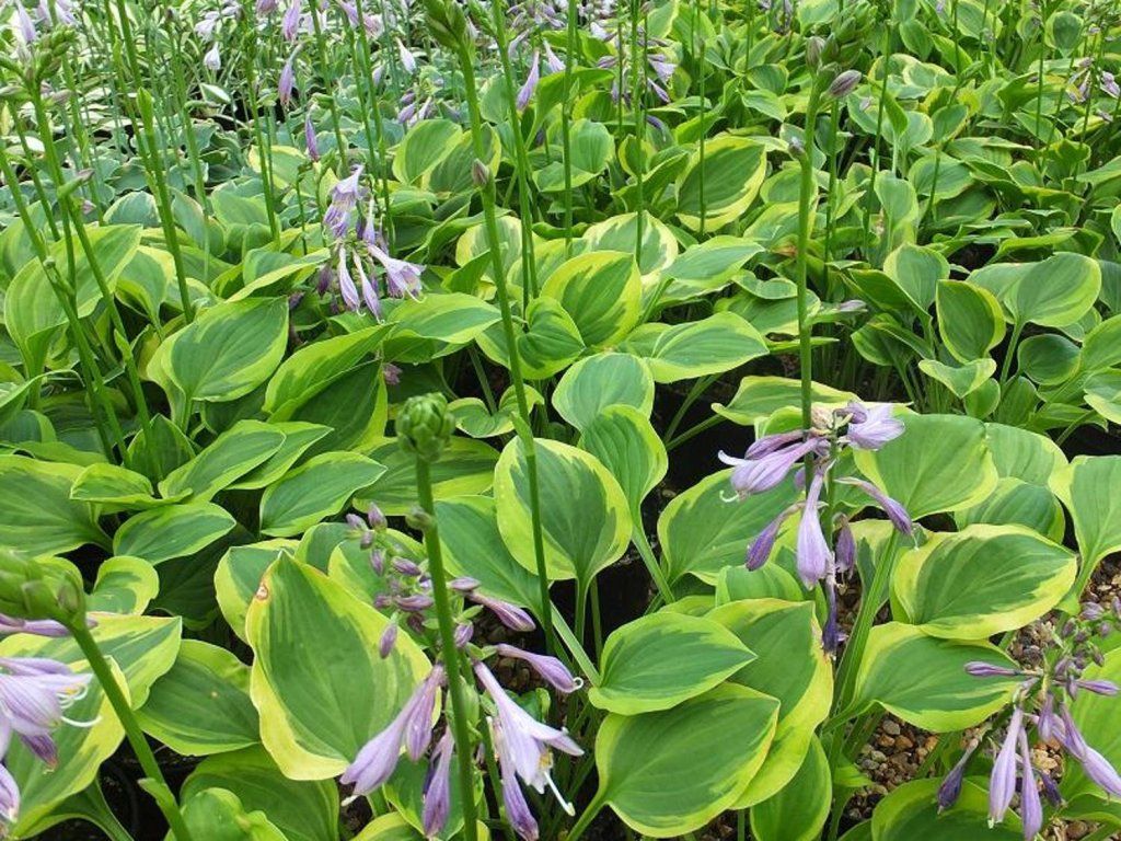 Funkie 'Golden Tiara' - eine Zwerg-Funkie, die jedoch formkompakt ist. Es handelt sich um eine bewährte Sorte mit einer langen Blütezeit, die im Schatten eine feine Goldlinie zeichnet und mit der Zeit einen zusammenhängenden Saum bildet. Die Gattung Hosta stammt aus Ostasien, insbesondere aus Japan und Korea. 'Golden Tiara' entstand als Sport von Hosta nakaiana und wurde 1977 von Robert P. Savory im Jahr 1977. Die Pflanze ist rhizomatös, horstbildend und langlebig, verdichtet sich schnell und wächst zu einem kompakten, breiteren Polster heran. Die Belaubung erreicht normalerweise eine Höhe von 25–35 cm, die Breite eines ausgewachsenen Horstes beträgt 80–100 cm. Die Blätter sind breit eiförmig bis herzförmig, meist 10–12 cm lang, mit einer glatteren Oberfläche und ausgeprägteren Blattstielen. Die Mitte ist mittelgrün, der Rand unregelmäßig chartreuse bis gelb, im Sommer wird er golden und kann bis zu cremefarben aufhellen. Von Juni bis August wachsen über der Belaubung 60–75 cm hohe Stiele mit einer lockeren Traube von 4–6 cm langen, glockenförmigen Blüten in lavendelfarbenen Violetttönen. Die Blüten werden von Bienen und Hummeln besucht, der Duft ist meist unauffällig. In der Komposition eignet sie sich als Beetbegrenzung und Unterpflanzung unter Sträuchern, passt gut zu Farnen, Purpurglöckchen und dunkelblättrigen Funkien, die Blätter eignen sich auch für Gestecke.