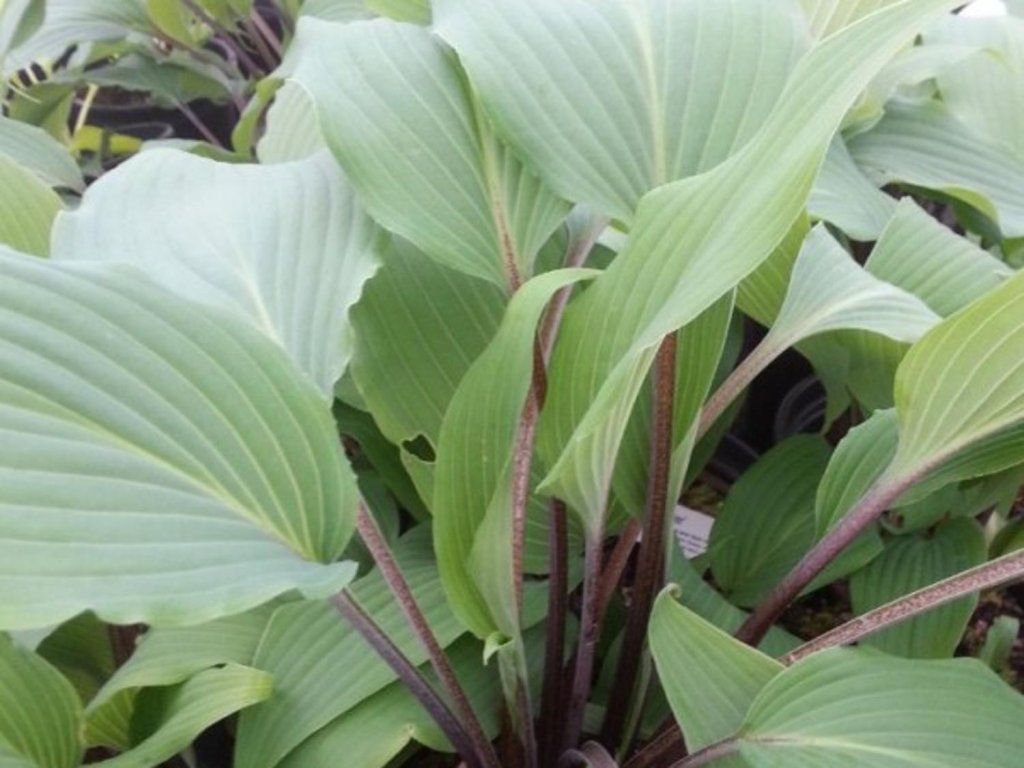 Funkie 'Red October' - die Blätter dieses mittelgroßen Kultivars sind grün bis grau-grün gefärbt und auf der Unterseite weiß gefärbt. Die Blattstiele sind deutlich rot. Reichhaltige Blüten haben eine hell-lavendelfarbene Farbe. Sie erscheinen im Spätsommer und Frühherbst. Wächst auf eine Höhe von 40-45 cm.