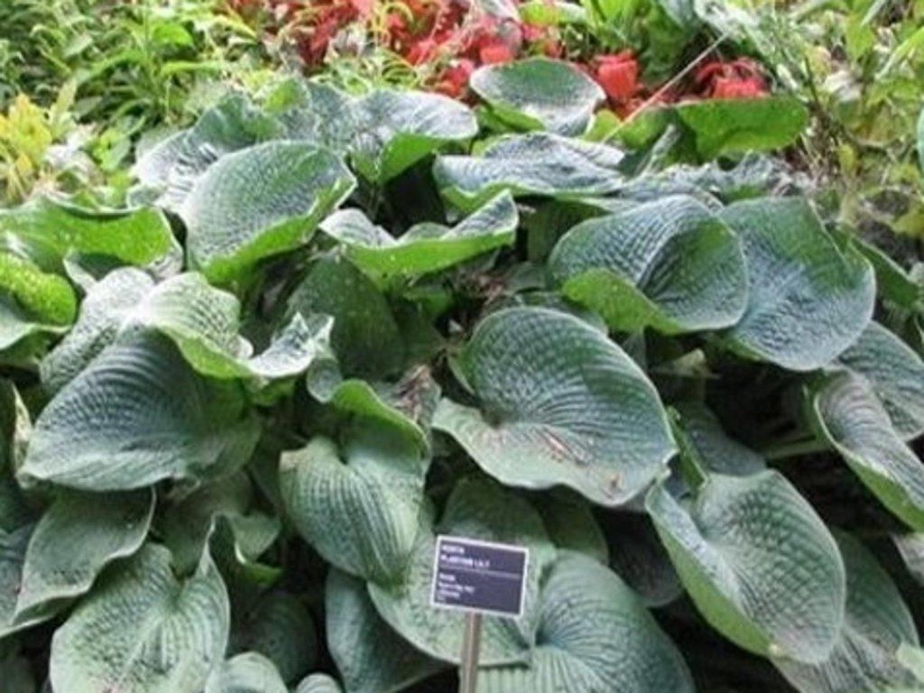 Funkie 'Ryan's Big One' - eine Sorte mit großen, gerippten, grau-blauen herzförmigen Blättern. Wird bis zu 70 cm hoch. Die Blüten, die von Juni bis Juli erscheinen, sind hellviolett.