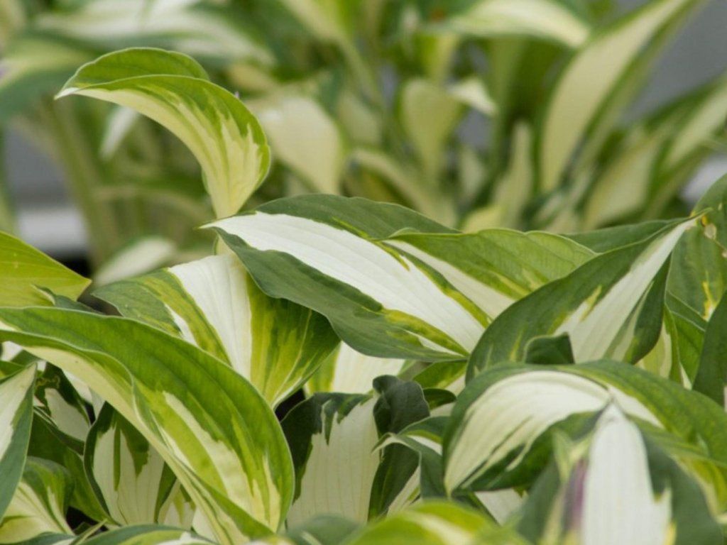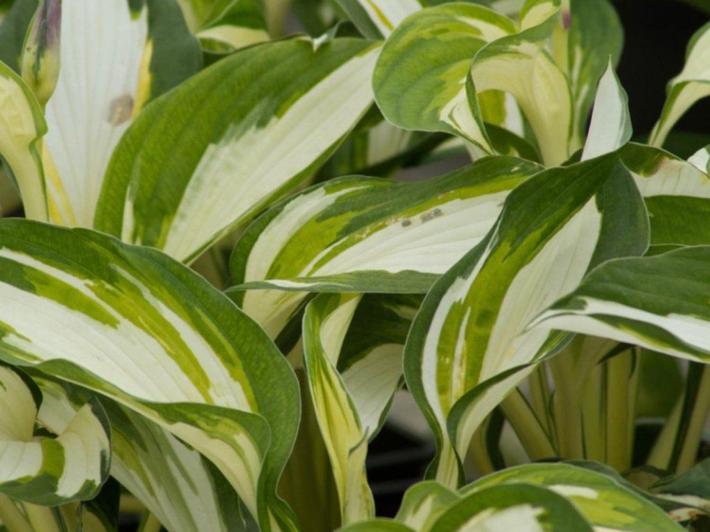 Funkien 'Vulcan' - eine sehr beliebte Sorte, die etwa 40 cm hoch wird. Die Blätter haben eine cremefarbene Mitte, die von Grün umrandet ist. Die Blüte ist hellviolett und erscheint ab Juli. Sie wird sich in der Nähe von Teichen, im Unterwuchs höherer Büsche oder Bäume sowie in Kübeln wunderschön zur Geltung bringen.