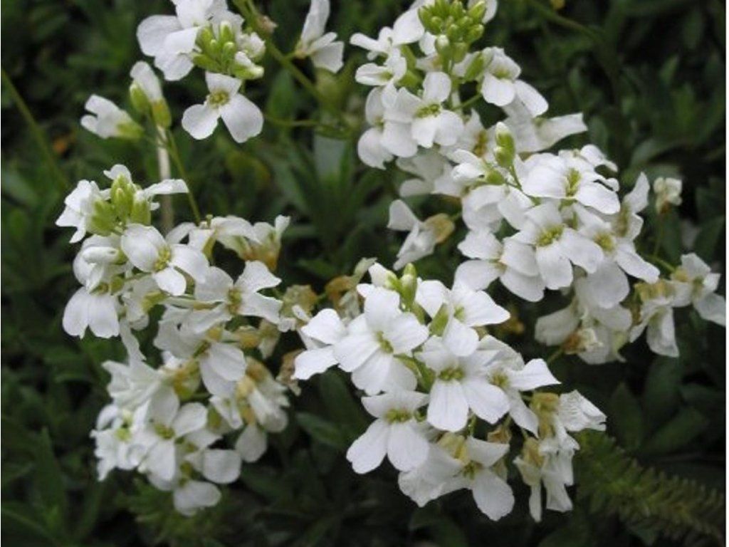Gänsekresse Sturii - eine kompakte Staude, die einen niedrigen, polsterförmigen Teppich bildet. Im Erwachsenenalter erreicht die Pflanze standardmäßig eine Höhe von etwa 5 - 10 cm. Wächst schnell und üppig. Die Polster blühen von April bis Mai reichlich mit kleinen, weißen Blüten, die einen zarten Duft verströmen. Die Blätter sind leicht behaart, panaschiert und grün gefärbt. Ideal für trockenere Standorte auf Steingärten, Terrassen, in Fugen, an Beeträndern, Böschungssteinen, Trögen, Trockenmauern usw. Es ist eine Nektarpflanze. Sie ist pflegeleicht und voll frosthart.