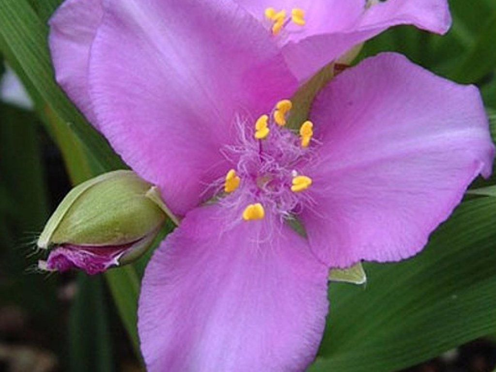 Andersons Dreimasterblume 'Charlotte' - eine neuere Sorte der Dreimasterblume, die je nach Anbaubedingungen eine Höhe von 60 - 70 cm erreicht. Frischgrüne Stiele tragen gebogene Blätter, die schmal, lang, fleischig und linealisch-lanzettlich sind. In der Mitte der höchsten Blätter befinden sich dreieckige Blüten, die von Juni bis September erscheinen. Die Blüten selbst sind luftig, leuchtend lila mit gelben Staubgefäßen. Diese sind von Flaum umgeben. Die Blüte wirkt sehr exotisch. Die Pflanze eignet sich für gemischte Staudenbeete.