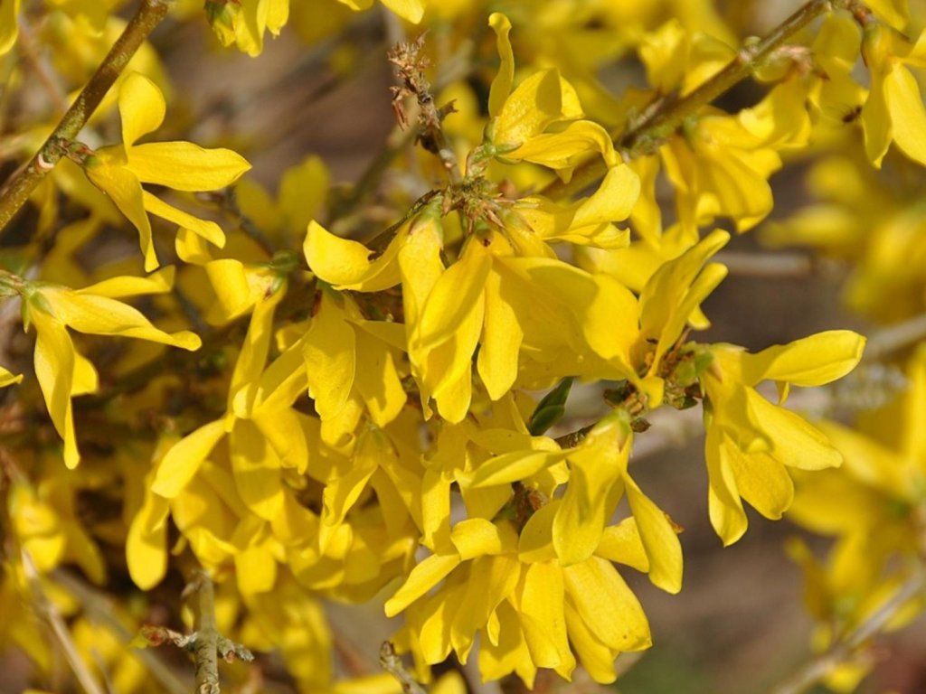 Forsythia intermedia 'Courtasol' Marée D´oR - eine Sorte, die eine Höhe von etwa 60 cm und eine Breite von etwa 120 cm erreicht. Früh im Frühling blüht sie mit leuchtend goldenen Blüten, die uns mitteilen, dass der Frühling an die Tür klopft. Auf die Blüten folgen mittelgrüne Blätter, die eiförmig bis lanzettlich sind. Forsythien oder auch Goldregen werden häufig für Hecken verwendet.