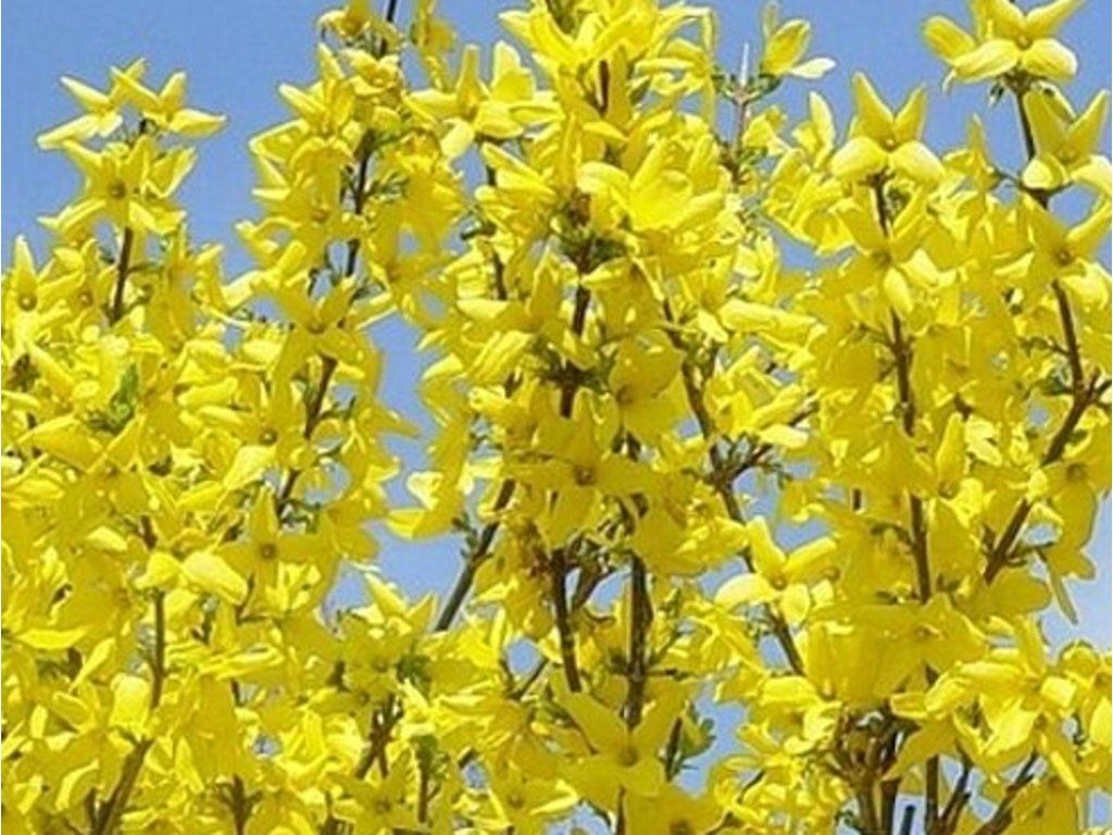 Forsythia intermedia 'Lynwood Gold' - ein Zierstrauch, der eine Höhe von 1 - 2 m erreicht. Der Wuchs ist aufrecht. Die Blätter sind lanzettlich, tiefgrün und werden mit Beginn der Sommermonate leicht dunkler. Im Herbst verfärbt sie sich dann gelb. Der Strauch ist wegen seiner Blüten sehr beliebt, die ab April erscheinen, noch bevor die Blätter austreiben, und die gesamte Pflanze förmlich übersäen. Sie sind leuchtend gelb, vierzählig und duften zart.