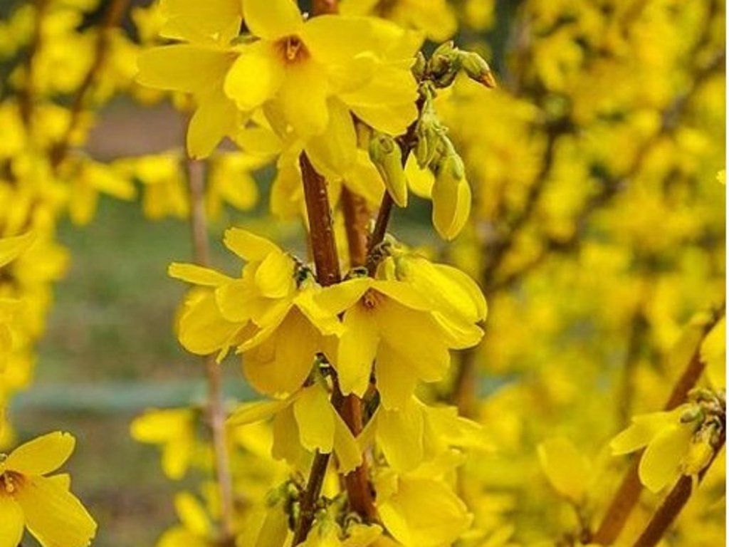 Forsythia intermedia, auch bekannt unter dem volkstümlichen Namen 'Goldflieder', stammt aus Europa und Asien und gehört aufgrund ihrer attraktiven Blüten und Blätter zu den beliebten Sträuchern. Dieser Strauch erreicht eine Höhe von 2-3 m und hat eine charakteristische aufrecht-ausladende Form. Seine Blätter sind länglich-eiförmig und frischgrün. Die Blüten der Forsythia intermedia sind intensiv gelb, perfekt geformt und haben eine typische trichterförmige Gestalt. Diese Blüten erscheinen bereits Anfang April, noch vor dem Austreiben der Blätter, und erzeugen einen Gesamteindruck von Frische und Frühling. Diese Pflanze ist in der Regel pflegeleicht und kann in verschiedenen Bodentypen gedeihen. Sie bevorzugt jedoch sonnige bis halbschattige Standorte und passt sich gut an durchlässige Böden an. Sie verträgt gelegentliche Trockenheit und ist hinsichtlich der Luftqualität nicht anspruchsvoll. Mit ihrem attraktiven Aussehen hat sie sich den Ruf als Frühlingsbote erworben und findet Anwendung in allen Gartenanlagen, aber auch in der Kübelbepflanzung oder auf Dachgärten.
