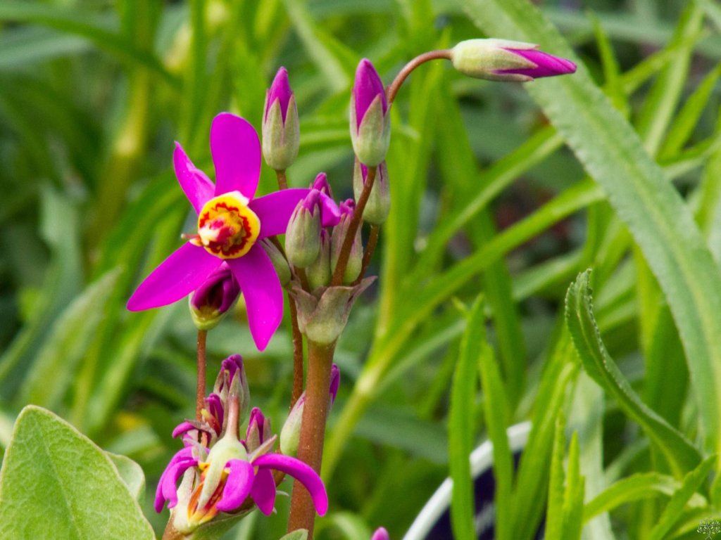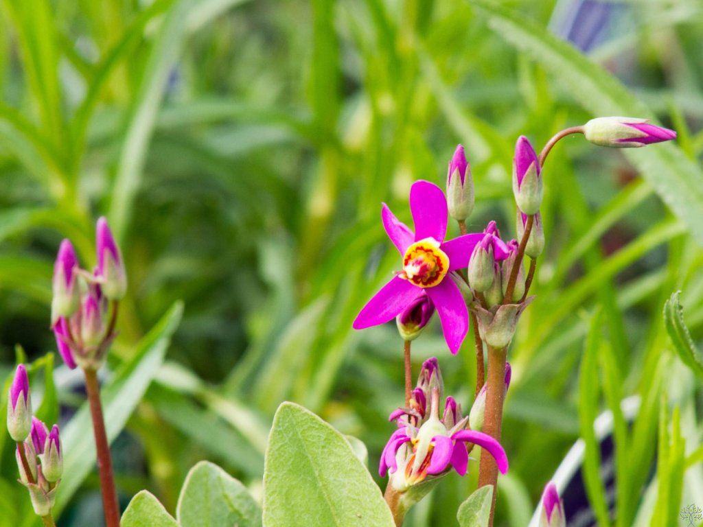 Garten-Schönstern 'Rote Farbe' - Syn. Primula meadia. Sie ist eine nordamerikanische Staude aus lichten Wäldern und Prärien, die sich durch ihre typische Frühlingsphänologie und Sommerruhe auszeichnet. Die Sorte 'Rote Farbe' bildet eine bodennahe Rosette aus länglich-lanzettlichen, hellgrünen Blättern und treibt aus einem kurzen Rhizom im Frühjahr schlanke, kahle Stängel aus. Im Mai und Juni öffnen sich an ihnen normalerweise 5–10 Blüten mit einer röhrenförmigen Basis und stark zurückgebogenen Kronenblättern, die nach oben gerichtet sind, während die Staubblätter und der Stempel nach unten gestreckt bleiben. Die Färbung ist ein deutliches Violett bis Rotviolett mit einem gelbem Zentrum, sodass die Pflanze auch im Halbschatten unter Sträuchern zur Geltung kommt. Nach der Blüte zieht der oberirdische Teil schnell ein, was sich gut für Pflanzungen mit anschließender Sommerstruktur eignet, zum Beispiel mit Funkien, Purpurglöckchen, Storchschnäbeln oder Farnen. Die Blüten liefern im Frühjahr Pollen und Nektar und sind daher für Bestäuber von Vorteil. Ideal als Ergänzung zu gemischten Beeten oder als Solitär im Halbschatten.