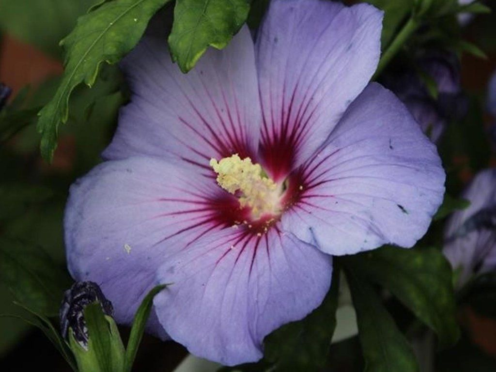 Syrischer Eibisch 'Blue Bird' - eine der ersten blau blühenden Sorten des anspruchslosen Eibisch, der einen aufrecht wachsenden, kompakten Strauch bildet. Er erreicht eine Höhe von 200-300 cm und eine Breite von etwa 100-150 cm. Ab Mitte Juli blüht er reichlich mit für Eibisch typischen, weit geöffneten Blüten. Er erstrahlt in lavendel- bis blauvioletter Farbe mit einem kontrastierenden weinroten Zentrum. Unter geeigneten Bedingungen blüht er bis in den September hinein. Laubabwerfende, dreilappige Blätter sind dunkelgrün und ergänzen die einfachen Blüten hervorragend. Hibiskus kommt in jeder Gruppenpflanzung oder einzeln als Solitärpflanze zur Geltung.