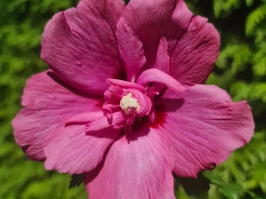 Hibiskus 'Flower Tower Ruby®' - gehört zur Kollektion der säulenförmigen Hibiskusarten, die für kleinere Gärten und moderne Pflanzungen gezüchtet wurden. Es handelt sich um einen eng aufrechten, laubabwerfenden Strauch mit dichtem Astwerk, der unter mitteleuropäischen Bedingungen etwa 3 m hoch und 0,8–1 m breit wird. Die Äste wachsen überwiegend senkrecht nach oben, nur schwach ausgebreitet, sodass der Strauch minimale Grundfläche einnimmt und einen ausgeprägten vertikalen Akzent setzt. Die Blätter sind kleiner, dreilappig, mittel- bis dunkelgrün und bilden während der Saison eine kompakte Belaubung. Die größte Zierde sind die Blüten, die vom späten Juli bis Oktober erscheinen. Sie sind halbgefüllt bis gefüllt, mit einem Durchmesser von etwa 7–9 cm, mit einem reichen Kranz aus Blütenblättern. Die Grundfarbe der Blüten ist intensiv rosa bis rubinrot, im mittleren Teil geht sie in ein dunkles rotes Auge über, das die Blüte optisch vertieft. Die satte Farbe zusammen mit der Fülle an Knospen verleiht dem Strauch ein markantes, aber dennoch kultiviertes Aussehen, das sich gut in modernen und klassischen Kompositionen einsetzen lässt. Die Blüten sind honigsüß und ziehen Bienen und andere Bestäuber an.