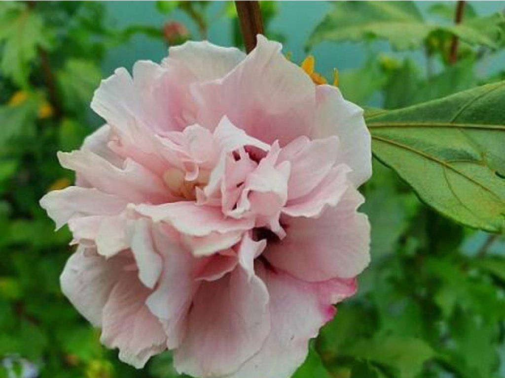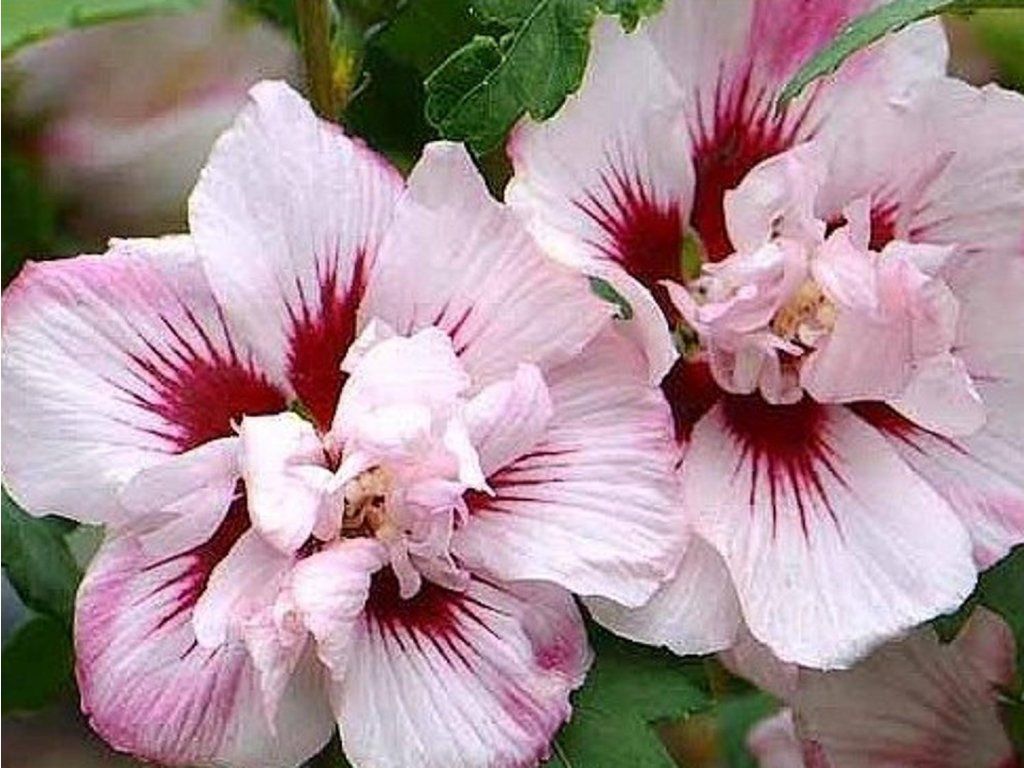 Syrischer Eibisch 'Lady Stanley' - eine außergewöhnliche Sorte des beliebten, anspruchslosen Eibischs, die einen aufrecht wachsenden, gepflegten Strauch bildet. Er gehört zu den historisch beliebten Sorten, die seit Jahrzehnten in Europa angebaut werden. Unter mitteleuropäischen Bedingungen bildet er einen aufrecht wachsenden, mittel- bis starkwüchsigen Strauch von 2,5–3 m Höhe und 1,5–2 m Breite. Die Blätter sind dreilappig, mittelgrün und treiben im späten Frühjahr aus. Die Blüten sind gefüllt, mit vielen inneren Blütenblättern, im Durchmesser 7–9 cm. Die äußeren Blütenblätter sind cremeweiß bis hellrosa, die inneren zartrosa, mit einer ausgeprägten dunkelroten Mitte. Die Blüte beginnt in der Regel im August und dauert bis September, in warmen Jahren auch bis Oktober. Einzelne Blüten halten nicht lange, aber die ständige Knospenbildung sorgt für einen langanhaltenden Effekt. Dank der ausgeprägten Form und Farbe der Blüten eignet sich die Sorte als Solitärpflanze im Rasen, in Gruppen mit anderen blühenden Sträuchern oder in Kombinationen mit Rosen und hohen Stauden, wie z.B. Phlox, Echinacea oder Ziergräsern.