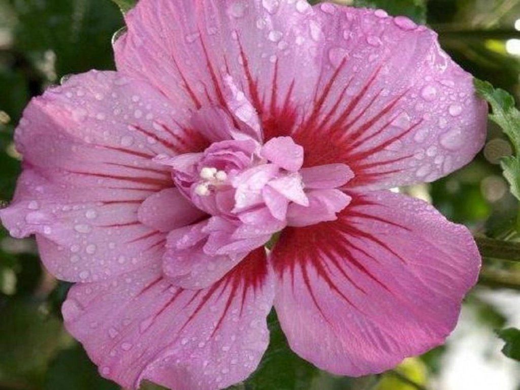 Syrischer Eibisch 'Maike' - ein laubabwerfender Strauch aus der Familie der Malvengewächse, der für seine späte und lange Blüte geschätzt wird, die im Garten an Sommerblumen und späte Stauden anschließt. Der Habitus ist aufrecht, dicht verzweigt und erreicht im Erwachsenenalter eine Höhe von etwa 2–3 m und eine Breite von 1,5–2 m. Die Blätter sind für diesen Kultivar auffällig, eng handförmig, 3-lappig, mittel- bis dunkelgrün und grob gezähnt, im Herbst vergilbend. Von Juli bis Oktober öffnen sich an den diesjährigen Trieben mittelgroße bis große Blüten, rosa mit einem ausgeprägten weinroten Auge, von dem feine Strahlen fast bis zu den Blütenblattspitzen reichen. In der Mitte der Blüte befindet sich eine zweite Reihe verkürzter Blütenblätter, so dass die Blüte halb gefüllt wirkt und eine feine Fältelung aufweist. Einzelne Blüten halten nur kurz, aber die Knospen wechseln sich schnell ab, daher ist der Strauch viele Wochen lang dekorativ. In der Komposition lässt er sich gut mit Kolkwitzien, Spieren, Lavendel und Ziergräsern kombinieren, wo der Rosaton silbrige und blaue Farben ausgleicht. Die Blüten werden von Bestäubern besucht, die halb gefüllte Struktur kann den Zugang zum Nektar leicht einschränken. Das Laub ist auch ohne Blüten dekorativ und hat eine feinere Textur als bei vielen gängigen Kultivaren. Die Blüten sind etwa 8–12 cm groß und wirken durch den geschichteten Mittelteil auch aus größerer Entfernung plastisch.