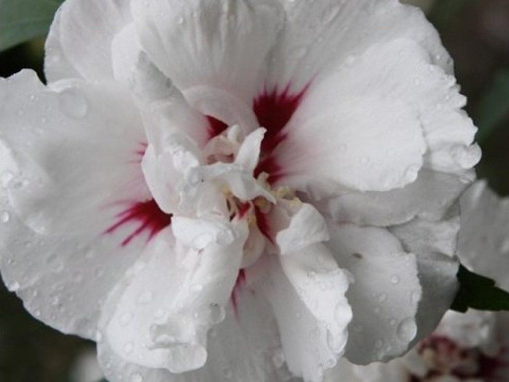 Hibiskus syriacus 'Monstrosus' - einzigartige Sorte des beliebten Hibiskus, die (wie der Name schon sagt) abnormell große Blüten aufweist. Er bildet einen aufrecht wachsenden, ansehnlichen Strauch, der eine Höhe von 2 - 3 m erreicht. Ab Juli schmücken ihn Dutzende von großen, reinweißen Blüten mit einem kontrastierenden, weinroten Zentrum und Aderung. Die Blüten halten unter geeigneten Bedingungen bis in den September hinein. Laubabwerfende, dreilappige Blätter sind dunkelgrün und ergänzen die einfachen Blüten hervorragend. Hibiskus kommt in jeder Gruppenpflanzung oder einzeln als Solitärpflanze zur Geltung.