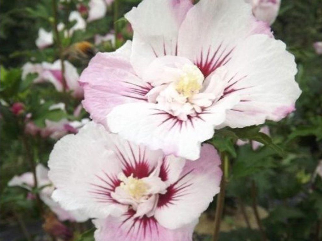 Syrischer Eibisch Pinky Spot 'Minspot' - Hibiskus ist eine immer beliebtere Pflanze. Dank der Vielfalt der Blütenfarben. Er erreicht eine Höhe von 2 - 3 m und eine Breite von etwa 1,5 m. Dies ist eine verbesserte Version des Hibiskus 'Lady Stanley'. Die Blüten sind halbgefüllt und etwa 7 cm breit. Sie sind breit. Die Grundfarbe Weiß wird von einem rosa Schimmer mit weinroten Strahlen in der Mitte überlagert. Blüht üppig von Juli bis September. Eine junge Pflanze muss zuerst kräftig werden, um die Blüten bis zum Herbst zu halten. Die Blätter sind laubabwerfend, etwa 7 cm lang, dreilappig und gelappt. Sie haben eine mittel- bis dunkelgrüne Farbe. Sie treiben später aus, meist erst im April.