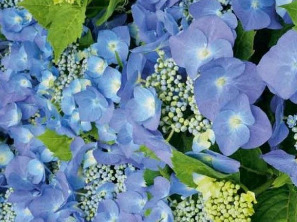 Bauernhortensie 'Blaumeise' - isteine der besten blau blühenden Hortensiensorten, die einen kompakten Strauch bildet, der im ausgewachsenen Zustand eine Höhe von etwa 1,2–1,5 m und eine Breite von etwa 1–1,3 m erreicht. Die Triebe sind verholzt, gut verzweigt, die Blätter breit eiförmig, tiefgrün, im Herbst manchmal ins Gelbliche übergehend. Tellerförmige Blütenstände erscheinen an den Triebspitzen von Juni bis August. Die Ränder der Blütenstände bilden größere sterile Blüten, das Zentrum kleine fruchtbare Blüten, die Nektar und Pollen liefern. In saurem Boden mit ausreichend Aluminium färben sich die Blüten blau, in neutraler Umgebung überwiegen rosa bis violette Töne. Diese Blütenstandstruktur wirkt natürlich und passt gut zu weniger formellen, leicht waldähnlichen Pflanzungen. Der Strauch kann als Solitär im Halbschatten oder in kleineren Gruppen in Kombination mit anderen Sträuchern verwendet werden. Sie ist für die Kübelkultur geeignet. Insgesamt ist die Hortensie ein beliebtes Element für Gärten und verleiht jedem Garten ein erhabenes und romantisches Flair. Die Hortensie ist mittelschwer im Anbau, wenn Sie ihr jedoch günstige Bedingungen bieten, wird sie sich mit sehr reichen und schönen Blütenständen bedanken.