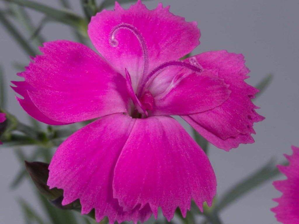 Gartennelke 'Dinetta Purple' - eine moderne Hybrid-Kultivarsorte der Gartennelke, die sich durch leuchtend violette bis purpurne Blüten und kompaktes Wachstum auszeichnet. Sie erreicht eine Höhe von 15-20 cm. Die Blüten sind groß, leuchtend mit feinen, gezackten Rändern und erscheinen Ende Mai bis September. Sie sind eine Anziehung für Bienen und Schmetterlinge. Schmale, grau-grüne Blätter bilden einen dichten und regelmäßigen Horst, der der Pflanze auch außerhalb der Blütezeit ein gepflegtes Aussehen verleiht. Dank ihres kompakten Wuchses und der reichen Blüte ist sie ideal für die Kultivierung in Töpfen, Balkonkästen oder Hängeampeln. Sie eignet sich zur Abgrenzung von Beeten, wo sie einen auffälligen Farbstreifen bildet.