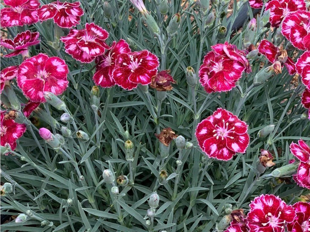 Nelkenart 'Ruby Glitter' aus der Mountain Frost Collection - ein immergrünes Steingartenpflänzchen, das Polster bildet. Erreicht eine Höhe von 15 - 20 cm und eine Breite von 25 - 30 cm. Die Blätter wachsen in Büscheln, sind schmal, steif und silbrig-blau. Blüht mit größeren, intensiv roten Blüten mit cremeweißen Flecken, die einfach sind und sehr angenehm duften. Der Schlund ist mit einem helleren Farbton durchzogen. Die Blüten sind leicht gewellt und am Rand fein gezackt. Die Blüten erscheinen ab Anfang Juni und blühen den ganzen Sommer über. Die Pflanze eignet sich für Steingärten, Staudenbeete, Einfassungen, Behälter usw.