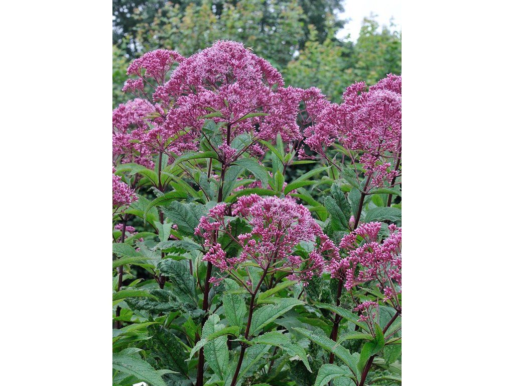 Gefleckter Wasserdost 'Riesenschirm' - botanisch als Eutrochium maculatum geführt, im Gartenbau oft unter dem älteren Namen Eupatorium. Sie stammt aus dem östlichen Nordamerika, wo sie auf feuchten Wiesen, an sumpfigen Rändern und entlang von Bächen wächst. Die Sorte 'Riesenschirm' bildet während der Saison kräftige, dunkelweinrote bis purpurschwarze Stängel und eine üppige Belaubung von lanzettlichen, gesägten Blättern in sattgrüner Farbe. Im August und September erscheinen an den Stängelspitzen doldenähnliche Blütenstände, die üblicherweise 20–30 cm breit sind. Die Knospen blühen weinrot und gehen beim Aufblühen in hellrosa-purpurne Töne über, der Blütenstand duftet leicht und wird stark von Bienen, Hummeln und Schmetterlingen besucht. Nach der Blüte bilden sich federige Achänen und die trockene Silhouette des Bestandes behält auch im Winter ihre Struktur. In Kompositionen wird sie in naturnahen Pflanzungen mit Ziergräsern, Sonnenhüten, Fetthennen oder an Wasserelementen eingesetzt. Sie kommt als Solitärpflanze in jedem Garten wunderschön zur Geltung. Er widersteht Wind und Regen gut. Er ist vollkommen winterhart.