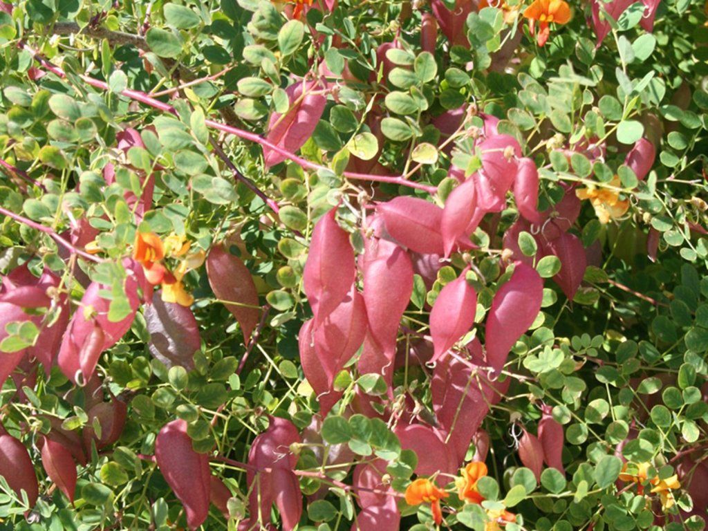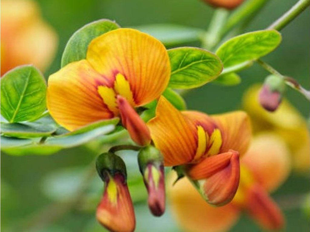 Ginster x media 'Copper Beauty' - höherer, laubabwerfender Strauch, der bis zu 3m in Höhe und Breite wächst. Das Wachstum ist sehr dicht und energisch. Die Blätter sind bis zu 15 cm lang und blaugrün. Blüht von Juni bis September, die Blüten sind auffällig und haben eine orange Farbe. Sie werden von großen, 'aufgeblasenen' Hülsen gefolgt.