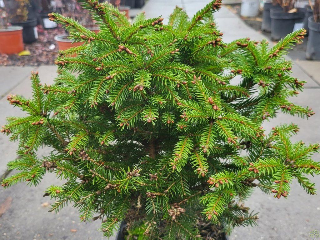 Gemeine Fichte 'Barryi' - eine Zwergform der Gemeinen Fichte, die sich durch eine kompakte, kugelförmige bis breit kegelförmige Gestalt auszeichnet. Sie wächst langsam und erreicht im Erwachsenenalter eine maximale Höhe von 4 Metern, was sie zur idealen Wahl für kleinere Gärten oder Steingärten macht. Die Nadeln sind dunkelgrün, kurz und dicht, was ihr ein dichtes, „kissenartiges“ Aussehen verleiht. Anfangs wächst sie zu einer kugelförmigen Form, später eher aufrecht mit einer sehr dichten, kompakten Krone.