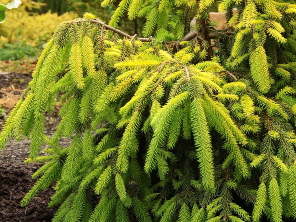 Fichte 'Gold Finch' - eine Zwergform der Gemeinen Fichte, die vor allem für ihre auffälligen und wunderschön gefärbten Nadeln bekannt ist. Im Alter von 10 Jahren erreicht die Sorte eine Höhe von etwa 50-60 cm und eine Breite von etwa 60-90 cm, je nach Wachstumsbedingungen. Die Nadeln sind kurz und wachsen über die gesamte Länge der Äste, die nach unten hängen und so einen interessanten Effekt erzeugen. Die an den Spitzen zugespitzten Nadeln sind frischgrün bis gelb gefärbt und machen den Kultivar sehr auffällig. Wir empfehlen, ihn an einem Standort mit Morgensonne und Nachmittagsschatten zu pflanzen, um eine intensivere Farbe zu fördern. Er ist pflegeleicht und eignet sich dank seines Wachstums hervorragend für Beete, größere Steingärten oder als Solitärpflanze.