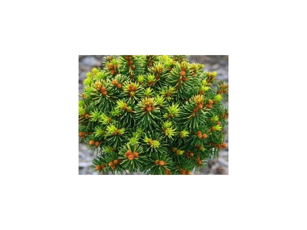 Fichte 'Gold Nugget' - langsam wachsender, vielgestaltiger Fichtenbaum in Form eines kompakten Kissens. Wenn er auf einen Stamm veredelt wird, ist die Krone ebenfalls kompakt. Das charakteristische Merkmal ist die gelbe Färbung der grünen Nadelspitzen, die das ganze Jahr über anhält. Er erreicht eine Höhe von 20 cm und eine Breite von 30 cm.
