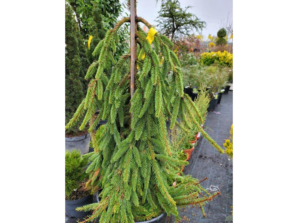 Gemeine Fichte 'Inversa' – eine europäische Nadelbaumart aus kälteren und feuchteren Fichtenwäldern von Skandinavien über die Alpen und Karpaten bis zum Balkan. In der Natur wächst er auf humosen, eher sauren Böden und verträgt lange Winter. Die Sorte 'Inversa' gehört zu den hängenden Gartenformen, deren Aussehen sich je nach Führung des Haupttriebs stark verändert. Ohne Anbindung bildet er einen niedrigen, breit ausgebreiteten Strauch mit kriechenden und kaskadenartig herabhängenden Ästen, der über Steine und Mauerkanten fällt. Bei Anbindung des Leittriebs an eine Stütze entsteht ein schmaler Baum, bei dem sich die Spitze am Ende der Stütze steil nach unten neigt und um den Stamm herum eine fein geschichtete „Schürze“ aus Überhängen bildet. Die jährlichen Zuwächse liegen in Gärten je nach Feuchtigkeit und Nährstoffversorgung normalerweise bei etwa 10–20 cm. Die Nadeln sind kurz, vierkantig, 1–2 cm lang, dunkelgrün und an der Spitze leicht stechend, die Frühlingszuwächse sind oft eine Nuance heller. Die Zapfen erscheinen eher bei älteren Pflanzen, sind hängend, länglich, etwa 10–15 cm lang und reifen im Herbst zu braunen Tönen heran. In Kompositionen wirkt er als beständiges Formelement am Eingang, an Hängen, in Heidegärten und Schotterbeeten, wo er sich gut mit Heidekraut, Zwerg-Heidekraut, Blaubeeren, Rhododendren und Ziergräsern kombinieren lässt.