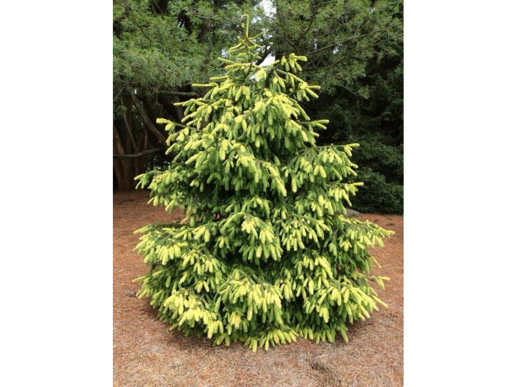 Pflege: Bevorzugt einen vollsonnigen Standort, der die intensive Färbung der Frühlingszuwächse und ein kompaktes Kronenwachstum fördert. Der Boden sollte fruchtbar, mittelschwer bis lehmig-sandig, gut durchlässig und dauerhaft leicht feucht sein, jedoch nicht dauerhaft vernässt. Am besten geeignet sind Böden mit saurer bis leicht saurer Reaktion, etwa im Bereich von pH 5–6,5, weshalb dem Pflanzloch oft Torf oder Nadelstreu beigemischt wird. Um den Wurzelballen herum ist Rindenmulch empfehlenswert, der Temperaturschwankungen und Austrocknung des Bodens reduziert und gleichzeitig das flache Wurzelsystem schützt. Containerpflanzen werden von März bis Oktober gepflanzt. In warmen und trockenen Perioden ist eine regelmäßige Bewässerung vorteilhaft, insbesondere in den ersten zwei bis drei Jahren nach der Pflanzung. Nach dem Einwurzeln verträgt die Fichte vorübergehende Trockenheit, jedoch führen langanhaltende Trockenperioden zu einem Austrocknen der Triebspitzen, besonders in städtischer Umgebung. Die Frostbeständigkeit des Kultivars liegt bei etwa –26 °C. In normalen Wintern in Ebenen und Mittelgebirgen bereitet der Winterschutz keine Probleme, junge Pflanzen in Behältern überwintern jedoch besser geschützt oder nach dem Einlassen des Behälters in den Boden. Die Düngung ist sparsam. Im Frühjahr genügt eine einmalige Gabe von Dünger für Zierkoniferen, die ein gleichmäßiges Wachstum ohne übermäßige Verlängerung der Triebe fördert. Der Schnitt beschränkt sich auf das Entfernen trockener, erfrorener oder beschädigter Äste; eine grundlegende Formgebung ist nicht notwendig. Bei ungünstigen Bedingungen können Pilzkrankheiten des Nadelwerks auftreten, und Schädlinge wie Spinnmilben oder Blattläuse können vorkommen. Ein luftiger Standort, gleichmäßige Feuchtigkeit und eine nicht übermäßige Stickstoffdüngung reduzieren ihr Auftreten erheblich. Bei Gruppenpflanzungen wird ein Abstand von mindestens 2,5–3 m zwischen den einzelnen Pflanzen oder größeren Gehölzen empfohlen, damit die Sorte genügend Platz hat, ihre volle Form und Farbe zu entfalten.