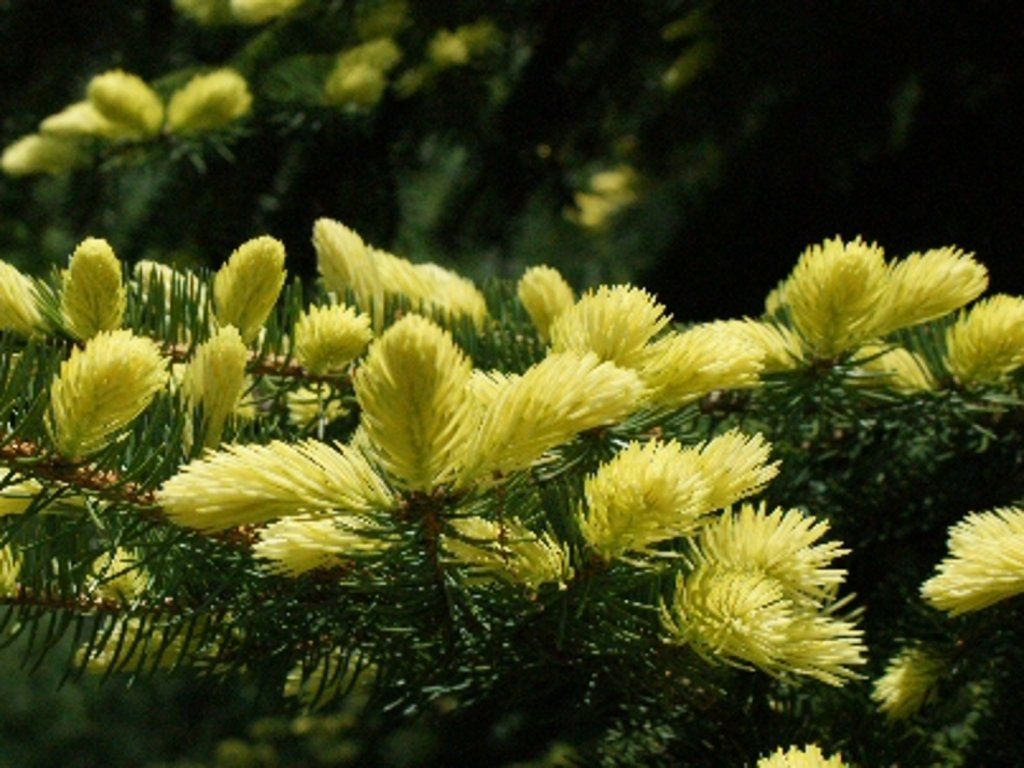 Gemeine Fichte 'Perry's Gold' - attraktiver Berg-Nadelbaum aus den kälteren und feuchteren Fichtenwäldern Nord- und Mitteleuropas. Die Sorte 'Perry's Gold' entstand als Selektion, die Anfang der 90er Jahre in den USA gefunden wurde, und wurde unter dem Namen eingeführt, der an den Entdecker Arthur Perry erinnert; manchmal wird sie auch unter dem Synonym 'Perry's Golden' geführt. Die Pflanze bildet einen kompakten, regelmäßig kegelförmigen Habitus mit leicht überhängenden Zweigspitzen und einem gut sichtbaren Leittrieb. Die Nadeln sind kurz, vierkantig, dicht entlang der Zweige angeordnet, im Sommer dunkelgrün und auch im Winter immergrün. Der Haupteffekt tritt im Frühjahr, normalerweise im April bis Mai, ein, wenn die neuen Triebe butter- bis goldgelb austreiben und sich über mehrere Wochen allmählich grün färben. Bei älteren Pflanzen können sich längliche, hängende Zapfen entwickeln, die typisch für die Gemeine Fichte sind und im Herbst zu braunen Tönen reifen. In einem kleineren Garten fungiert sie als fester Punkt am Eingang, im Steingarten und im Heidegarten, wo der goldene Austrieb blaue und silbrige Nadelbäume, Rhododendren, Heidelbeeren und Ziergräser hervorhebt.