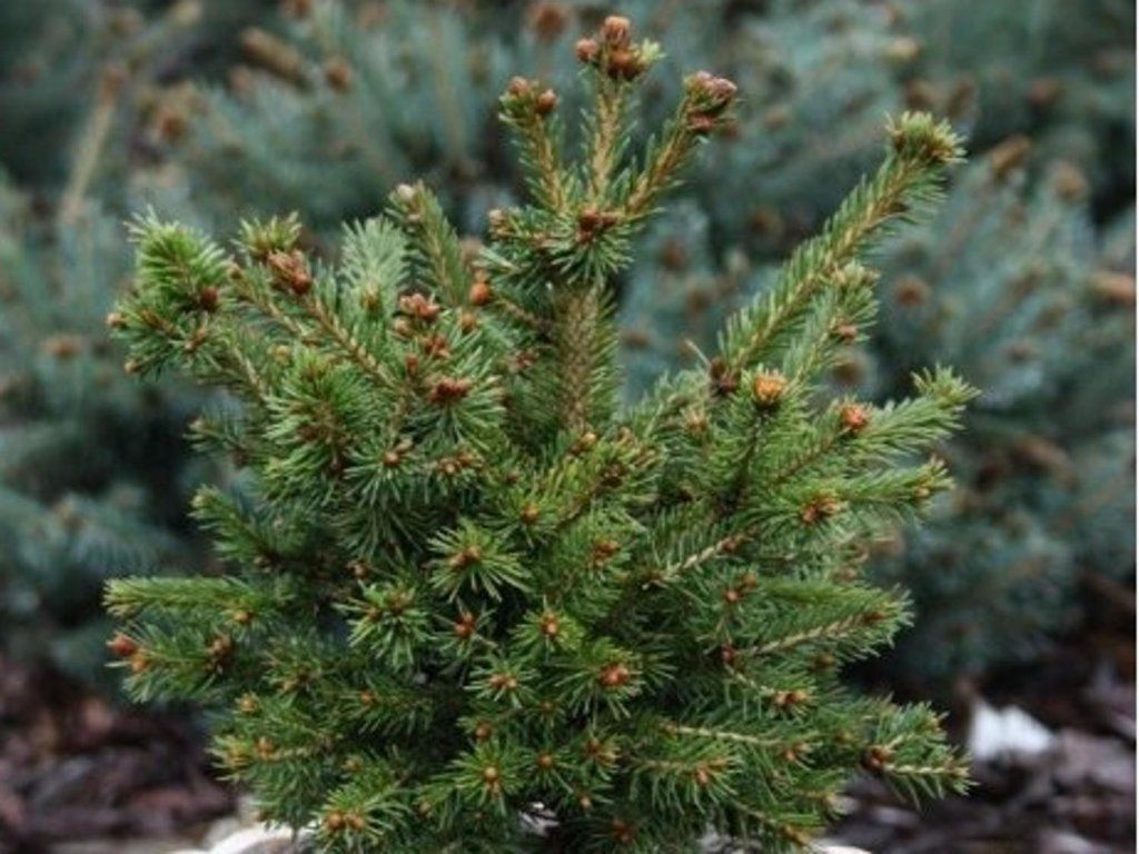 Fichte 'Petra' - langsam wachsender Kultivar mit regelmäßigem, verdichtetem, konischem Wuchs. Die grünen Nadeln sind fein, dünn, im Frühjahr sind sie heller. Erreicht eine Höhe von 70 cm und eine Breite von 40 cm.