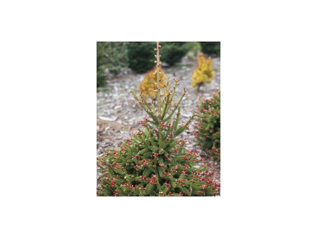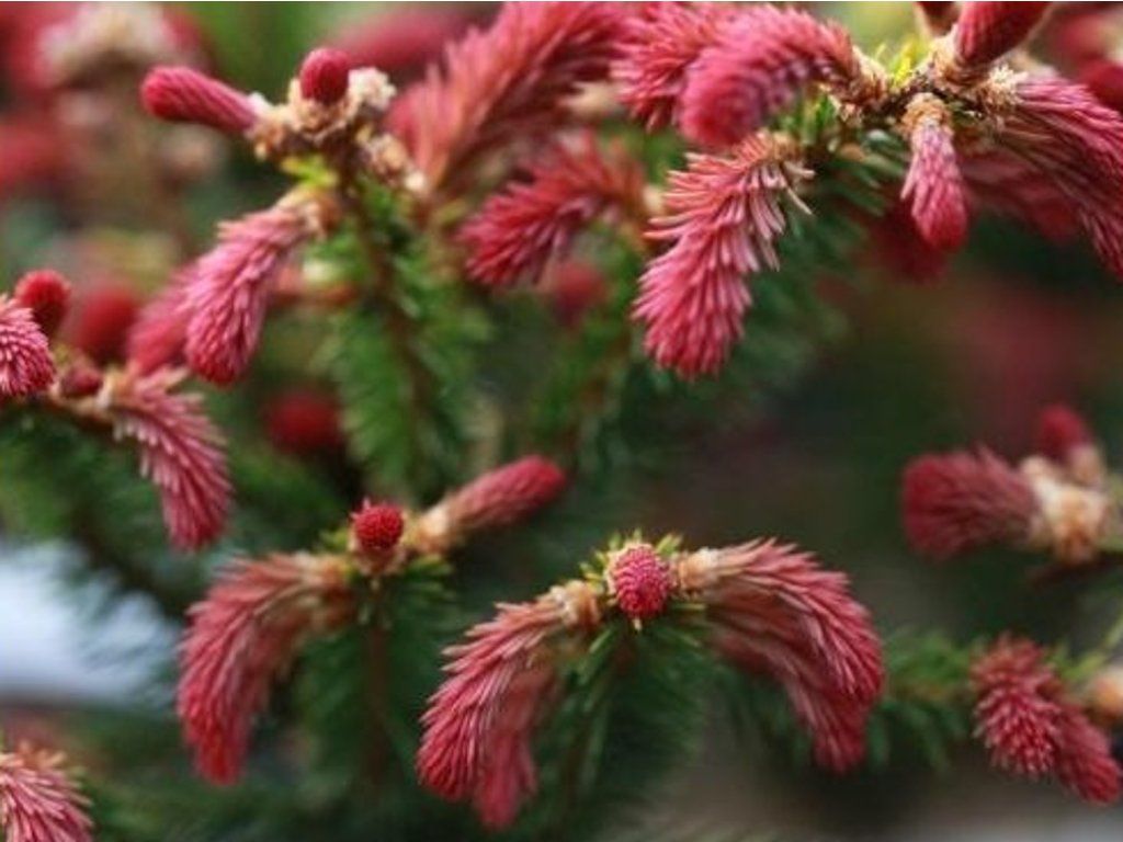 Gemeine Fichte 'Rydal' - eine sehr besondere und interessante Sorte der Gemeinen Fichte, die sich durch ihre rosafarbenen neuen Triebe auszeichnet. Die Sorte 'Rydal' hat ihre Wurzeln in Schweden. Die neuen Triebe verfärben sich nach etwa drei Wochen wieder zur klassischen grünen Farbe. Das Wachstum ist mäßig langsam, die Endhöhe wird nach 10 Jahren erreicht, die Form ist locker und kegelförmig. Die Sorte erreicht im Erwachsenenalter eine Höhe von etwa 1,5 m und eine Breite von 1 m. Sie kann je nach Kulturbedingungen bis zu 5 m hoch werden. An den Astspitzen bilden sich Zapfen, die ebenfalls rosa-weinrot gefärbt sind. Dadurch wird der Baum sehr auffällig. Die jährlichen Zuwächse liegen bei etwa 5 bis 8 cm. Die Nadeln wachsen üppig entlang der gesamten Zweige. Wenn Sie einen Nadelbaum suchen, der auf den ersten Blick beeindruckt, dann ist die Sorte 'Rydal' die richtige Wahl.