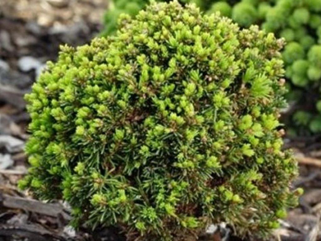 Fichte 'Van Bemel's Dwarf' - vielseitige Sorte mit starker, kugelförmiger Form, wächst sehr langsam. Nadeln sind grün. Im Alter von zehn Jahren erreicht sie eine Höhe von 30 cm und einen Durchmesser von 30 cm. Perfekt für kleine Gärten geeignet.