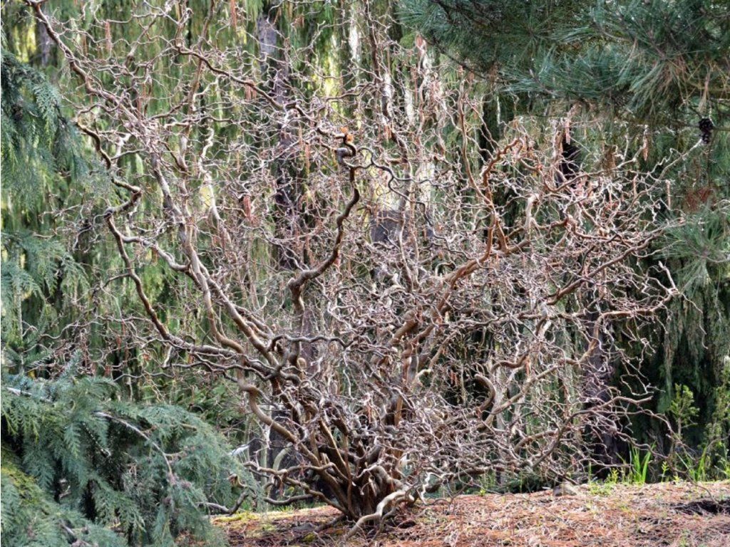 Haselnuss 'Contorta' - eine Kultivarsorte der gewöhnlichen Haselnuss, die Mitte des 19. Jahrhunderts als zufällige Mutation in einer Hecke in England entdeckt wurde. In Gärten gemäßigten Klimas bildet sie einen dichten Strauch oder kleinen Baum mit einer breit ausladenden, kugelförmigen Krone, die je nach Standort und Schnitt normalerweise 3–4 m hoch und 3–4 m breit wird. Charakteristisch sind stark verdrehte, spiralförmig gewundene Zweige, deren Struktur besonders im Winter und nach dem Vasenschnitt zur Geltung kommt. Die Blätter sind breit eiförmig bis rundlich, zu Beginn der Vegetationsperiode frischgrün, später matt mittelgrün, meist leicht gewellt und teilweise gedreht. Im Herbst verfärben sie sich in gelbliche Töne. Im Winter sind an den Zweigen bereits die angesetzten männlichen Blütenstände sichtbar, die sich von Februar bis März zu hängenden gelben Kätzchen von etwa 4–7 cm Länge verlängern und einen deutlichen frühen Frühjahrseffekt erzielen. Männliche Kätzchen kommen auf dem kahlen Holz auch in der Floristik zum Einsatz, insbesondere in Gestecken und Kränzen. Nach der Bestäubung, die überwiegend durch Wind erfolgt, reift im Spätsommer eine geringere Menge typischer Haselnüsse heran, die in hüllartigen Gebilden verborgen sind. Die Nüsse sind essbar, geschmacklich entsprechen sie der gewöhnlichen Haselnuss, sie enthalten einen hohen Anteil an pflanzlichen Ölen, Proteinen, Vitamin E und B-Vitaminen sowie Mineralstoffen wie Magnesium und Phosphor. Sie finden Anwendung als Bestandteil einer ausgewogenen Ernährung, frisch, geröstet oder in Gebäck und Desserts. In der Gartengestaltung wird die Haselnuss 'Contorta' hauptsächlich als Solitär auf dem Rasen, an Eingängen oder Terrassen verwendet, wo sich die verdrehte Verzweigung hervorhebt, oder als Solitärelement oder in Kombination mit Nadelgehölzen, japanischen Ahornen, Ziergräsern und niedrigen Sträuchern.