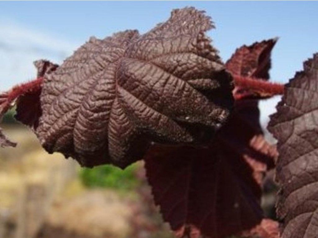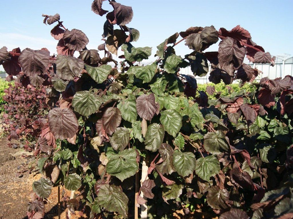Haselnuss 'JM251' Purple Umbrella - eine rotbraune Haselnuss-Sorte, die Krone hat eine schirmartige Form. Sie überschreitet normalerweise nicht eine Höhe von etwa 2 m. Die Blätter sind relativ breit, herzförmig, im Frühling dunkelviolett bis schwarz. Mit der Zeit hellen sie etwas auf. Die Blattoberfläche ist leicht gewellt. Die Sorte wird für kleinere Gärten empfohlen. Sie kann einzeln oder in Kombination mit Sträuchern gepflanzt werden.