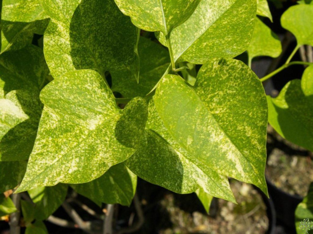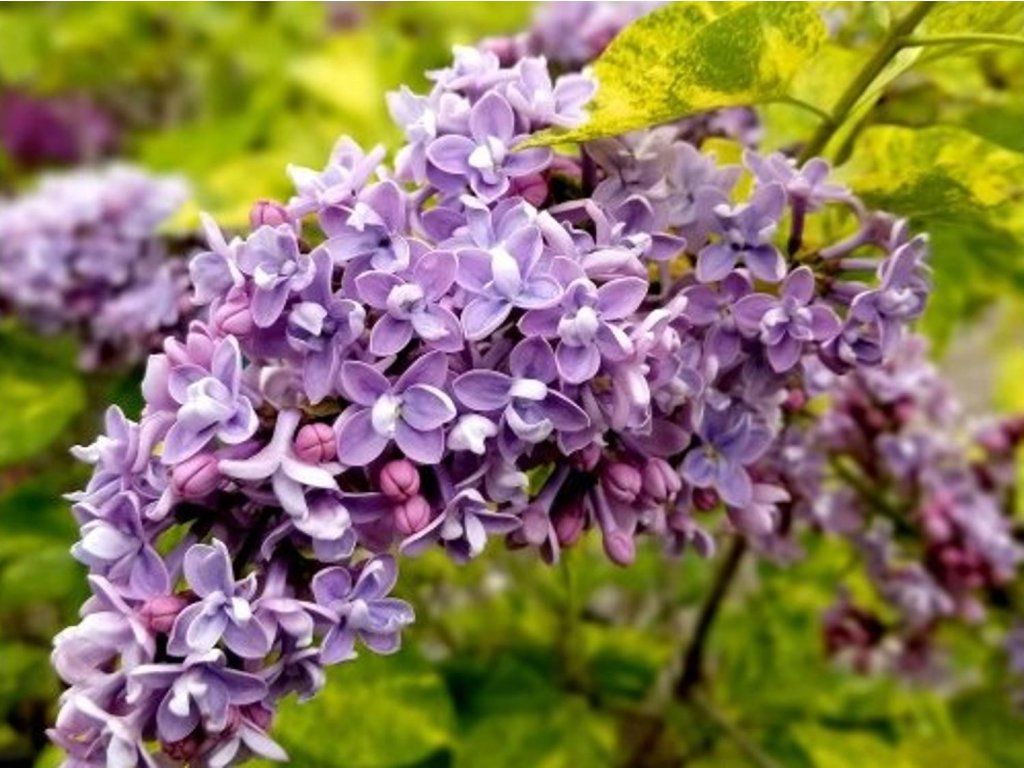 Flieder 'Aucubaefolia' - eine Zierform des Flieders, die vor allem für ihre ausgeprägt panaschierten Blätter und ihr dekoratives Aussehen während der gesamten Vegetationsperiode geschätzt wird. Er gehört zu den weniger üblichen, aber sehr attraktiven Kultivaren, die nicht nur zur Blütezeit, sondern auch lange danach beeindrucken. Er wächst als mittelstarker, aufrechter Strauch, der normalerweise 2,5 bis 3,5 Meter hoch und ähnlich breit wird. Der Habitus ist fest, gut verzweigt und wirkt mit zunehmendem Alter elegant und repräsentativ. Das größte Merkmal des Kultivars sind die großen, herzförmigen Blätter, die dunkelgrün mit auffälligen gelben bis cremefarbenen Flecken sind. Diese Panaschierung erinnert an die Blätter der Aucuba und ist im Frühjahr und Frühsommer am ausgeprägtesten. Die Blätter sind bis zum Herbst, wenn sie abfallen, dekorativ. Die Blüten erscheinen im Mai. Sie sind einfach, hellviolett bis lila, angeordnet in mittelgroßen Rispen. Die Blüten duften angenehm, obwohl der Duft zarter ist als bei einigen dunkelblühenden Kultivaren. Die Blüte ist regelmäßig, aber der Hauptzierwert dieses Kultivars sind die Blätter, nicht die Blüten. Er ist voll frosthart und verträgt auch städtische Umgebungen gut. Er kommt vor allem als Solitär zur Geltung, wo sein ungewöhnliches Laub voll zur Wirkung kommen kann, eignet sich aber auch für gemischte Strauchgruppen, repräsentative Gärten und Parkanlagen. Er wirkt sehr schön in Kombination mit dunkelgrünen Sträuchern oder Nadelgehölzen.