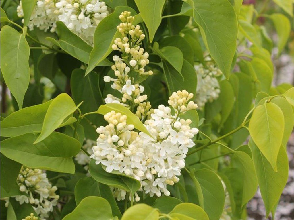Flieder 'Jan van Tol' - ein laubabwerfender, laubartiger Strauch oder Baum, der je nach Wachstumsbedingungen eine Höhe von 5-7 m und eine Breite von etwa 3-4 m erreicht. Die Wuchsform ist aufrecht, breit verzweigt. Die Blätter sind bis zu 7 cm lang, breit herzförmig, mittel- bis dunkelgrün gefärbt und verändern im Herbst ihre Farbe zu einem gelbbraunen Ton. Die Blüten sind einfach, röhrenförmig, weit geöffnet, duften sehr süß und haben eine frische weiße Farbe. Sie sind in dichten Trauben angeordnet, die bis zu 20 cm lang sind. Die Pflanze blüht im Mai. Flieder ist eine ideale Solitärpflanze, findet aber auch in Gruppenpflanzungen mit niedrigeren und ähnlich gefärbten Stauden Anwendung.