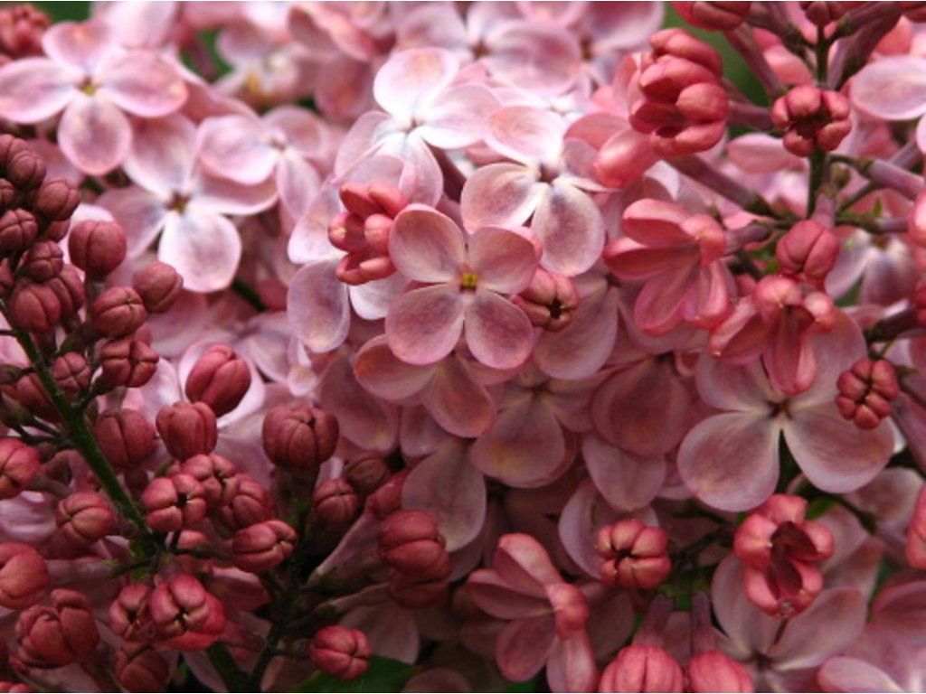 Flieder 'Mulatka' - ein laubabwerfender Strauch, der bis zu 3 m hoch und breit wird. Der Habitus ist aufrecht mit ovaler Krone. Die Blätter sind bis zu 7 cm lang, breit herzförmig, mittelgrün gefärbt und verändern ihre Farbe auch im Herbst kaum, sie sind leicht verdreht. Die einzelnen Blüten sind röhrenförmig, weit geöffnet und duften sehr süß und intensiv. Sie blühen im Mai. Sie haben eine ausgeprägte hellrosa Farbe und sind in Rispen angeordnet. Sie kommt als Solitärpflanze gut zur Geltung, findet aber auch in Gruppenpflanzungen ihren Platz.