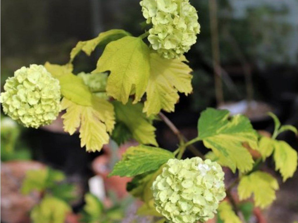 Gemeiner Schneeball 'Pechcin' - neuere Sorte mit attraktiven bunten Blättern. Diese sind 3-5-lappig. Sie haben eine dunkelgrüne Farbe mit unregelmäßiger gelber Panaschierung. Im Laufe der Saison wird die gelbe Färbung dominanter. Kleinere sterile Blüten bilden große, kugelförmige Blütenstände. Sie erscheinen schrittweise im Mai bis Juni. Im Herbst werden sie durch kleine Beeren ersetzt.