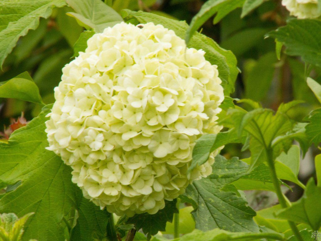 Gemeiner Schneeball 'Roseum' - ein alter Gartenkultivar des gemeinen Schneeballs, der seit Jahrhunderten in europäischen Gärten kultiviert wird. Der Grundkultivar stammt aus Europa, Westasien und Nordafrika und kommt in der Natur in Auenwäldern, an den Rändern von Feuchtgebieten und entlang von Wasserläufen vor. 'Roseum' bildet einen großen, dichten, locker kugelförmigen, laubabwerfenden Strauch mit anfangs aufrechten, später leicht überhängenden Ästen. Unter mitteleuropäischen Bedingungen erreicht er normalerweise eine Höhe und Breite von 3–4 m, bei sehr günstiger Lage bis zu etwa 5 m. Die Blätter sind handförmig gelappt, frischgrün und färben sich im Herbst in karminroten und orangen Farbtönen. Von Ende Mai bis Juni trägt er dichte, kugelförmige Blütenstände mit einem Durchmesser von etwa 8–10 cm, die aus sterilen weißen Blüten bestehen und beim Verblühen leicht grünlich oder rosa werden können. Diese Sorte bildet keine Früchte, ihr fehlen also die typischen roten Beeren; ihre Hauptzierde sind die auffälligen Blütenstände und die Herbstfarben der Blätter. Er zeichnet sich als Solitär auf dem Rasen, in einer frei wachsenden Hecke und in Kombinationen mit Hortensien, Spieren, Flieder und Ziergräsern aus. Kugelförmige Blütenstände werden häufig für den Schnitt in eine Vase verwendet, wo sie mehrere Tage halten und allmählich ihren Farbton ändern.