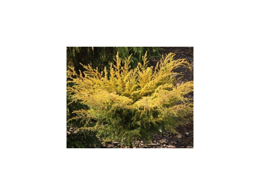 Gewöhnlicher Wacholder 'Depressa Aurea' - ein mittel schnell wachsender Kultivar mit offenem Wuchs. Sie zeichnet sich durch ihre goldgelbe Frühlingsfärbung aus, im Sommer wird sie grün, im Herbst und Winter haben die Nadeln eine gelb-braune Farbe. Die jährlichen Zuwächse betragen etwa 15 cm. Sie erreicht eine Höhe von 50 cm und einen Durchmesser von 1,5 m.