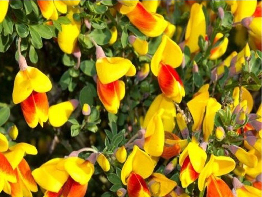 Geißklee 'Firefly' - ein laubabwerfender Strauch, der eine Höhe und Breite von 1,5 m erreicht. Schlanke Stiele sind gewölbt, im Mai und Juni übersät mit leuchtend gelben Blüten mit einem deutlichen roten Fleck.