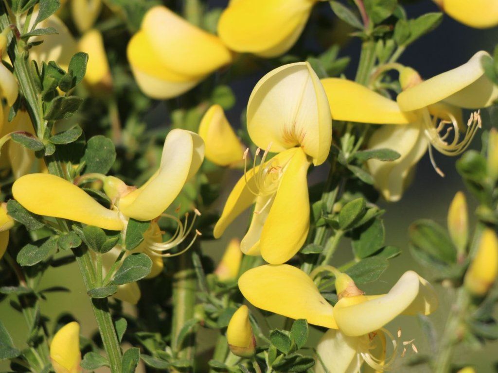 Ginster 'Luna' - attraktiver, laubabwerfender Strauch, der zu den niedrigen, dicht verzweigten Sträuchern gehört, die aus Hybriden von Steppen- und Heidekraut-Ginster aus Westeuropa stammen. Im Erwachsenenalter bildet er einen leicht überhängenden, brunnenförmigen Strauch von etwa 1–1,2 m Höhe und etwa 1,2 m Breite. Grüne, kleine dreizählige Blätter verlieren sich im Laufe der Saison teilweise zwischen den grünen, gerippten Trieben, die die Hauptdekoration tragen. Im Mai und Juni sind die einjährigen Triebe dicht mit leuchtend gelben, schmetterlingsförmigen Blüten bedeckt, die zart duften und Bienen sowie Hummeln anlocken. Nach der Blüte bildet er kleine Hülsen, die bei Reife platzen, weshalb er zu den giftigen Ziergehölzen zählt und nicht in Kinderspielecken gehört. 'Luna' wird in Heidegärten, an trockenen Hängen, in Kombination mit Wacholder, niedrigen Kiefern, Lavendel oder Ziergräsern eingesetzt, wo seine gelbe Blüte einen Kontrast zu grauen und blaugrünen Texturen bildet. Dank seines kompakten Wuchses eignet er sich auch für kleinere Gärten und naturnah gestaltete Kompositionen.