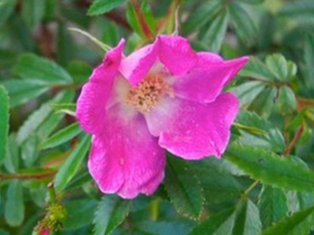 Glanzrose - ein blühender Strauch, der aus Nordamerika stammt und zu den botanischen Rosen zählt. Es handelt sich um einen niedrigen, unregelmäßig breiten Strauch. Die Dornen sind dicht und schlank, etwa 3 - 5 mm lang. Der gesamte Strauch erreicht eine Gesamthöhe von etwa 120 cm. Auf den ersten Blick fallen die Blüten auf, die einfach sind und eine dunkelrosa Färbung mit gelbem Zentrum haben. Die Blüten haben einen Durchmesser von etwa 4 cm. Und überschütten den ganzen Strauch buchstäblich. Sie erscheinen im Juni und Juli. Und als Bonus duften sie sehr angenehm nach Maiglöckchen. Nach dem Verblühen bilden sich dunkelrote Hagebutten an der Pflanze. Die Blätter sind grün, glänzend und die Herbstfärbung ist rot. Sie sind 1 - 3 cm lang und am Rand fein gesägt.