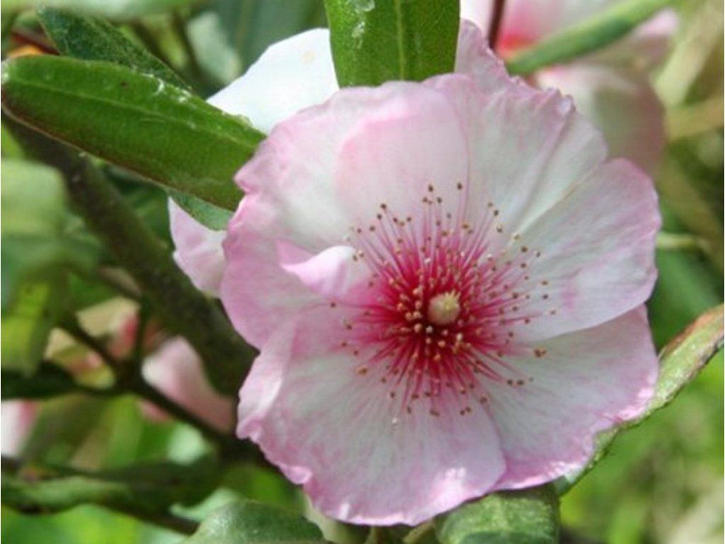 Eucryphia lucida 'Ballerina' - mittelgroßer Strauch mit säulenförmigem, aufrechtem Wuchs. Er erreicht eine Höhe von bis zu 8 m und eine Breite von 4m. Er lässt sich jedoch sehr gut zurückschneiden. Der Habitus ist ausgeprägt buschig. Von Juli bis August blüht sie mit kleineren (3 cm im Durchmesser) Blüten in zarten Rosatönen mit auffälligen karminroten Staubgefäßen. Die Blüten heben sich besonders auf dunkelgrünen, glänzenden Blättern ab.