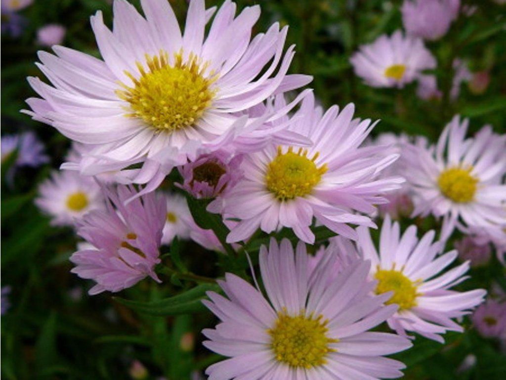 New Belgium Aster 'Fellowship' - auffällige und anspruchslose Aster, die eine Höhe von 140 cm erreicht. Sie benötigt eine Stütze, damit sie sich nicht biegt. Die strahlenförmigen Blüten haben dünne und lange Blütenblätter mit einer hellrosa Färbung und einem gelben Zentrum. Sie blühen von August bis Oktober. Dunkelgrüne Blätter sind klein und länglich. Besonders gut zur Geltung kommt sie in größeren Gruppen und in Gesellschaft anderer Pflanzen oder immergrüner Gehölze.