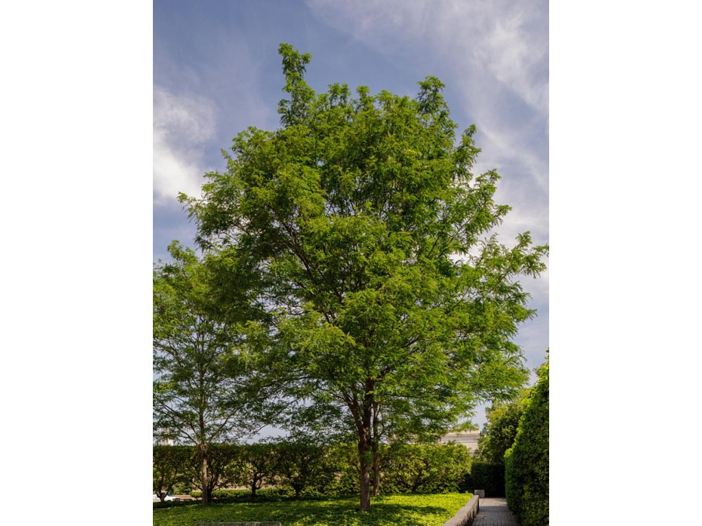 Gleditschie dreidornig stammt aus den östlichen Teilen Nordamerikas. Dieser Baum zeichnet sich durch charakteristische Blätter aus, die aus vielen kleinen Blättchen bestehen und einen leichten und zarten Schatten erzeugen. Er hat eine ausgeprägte architektonische Form mit schlanken Ästen, oft mit einer lockeren, unregelmäßigen Krone. Sein Stamm und seine Äste sind mit scharfen, verzweigten Dornen versehen, was in der Gartengestaltung der Grund für die Bevorzugung dornenloser Kultivare ist. Während der Blütezeit fallen die leuchtend gelben Blüten auf, die zwar klein, aber für Bienen attraktiv sind. Die Früchte stellen braune Hülsen dar, die bis zu 45 cm lang werden, halbmondförmig und leicht verdreht sind, sich allmählich von gelb-grün nach braun-rot verfärben und den ganzen Winter über am Baum verbleiben. Gleditschien bevorzugen volle Sonne und gut durchlässigen Boden, sind aber tolerant gegenüber verschiedenen Bedingungen, einschließlich harter Oberflächen. Sie sind trockenheits- und stadtklimaresistent, was sie in Stadtparks und Alleen beliebt macht. Ihre Fähigkeit, Luftstickstoff zu binden, ermöglicht schnelles Wachstum auch auf armen und steinigen Böden. Er wird als Ziergehölz in Parks und Gärten verwendet und passt sich leicht an die Bedingungen, auch in Tschechien, insbesondere in wärmeren Regionen, an. Dank ihres attraktiven Aussehens und ihrer Widerstandsfähigkeit werden Gleditschien häufig als Solitärgehölze oder in Gruppen gepflanzt und bereichern Parks, Gärten oder größere Grünflächen. Sie werden auch für ihre Fähigkeit geschätzt, Schatten zu spenden und dekorative Elemente im Landschaftsdesign zu sein.